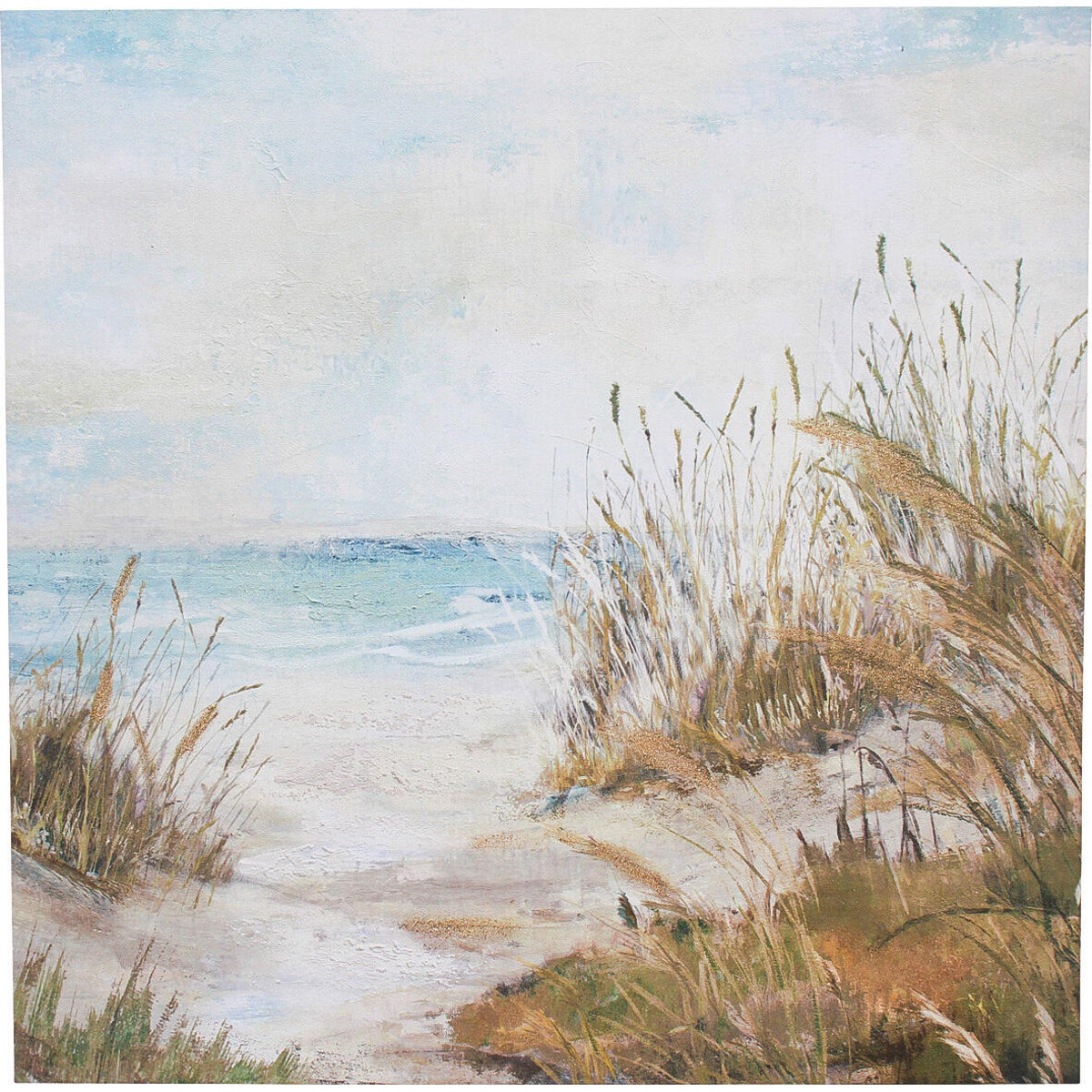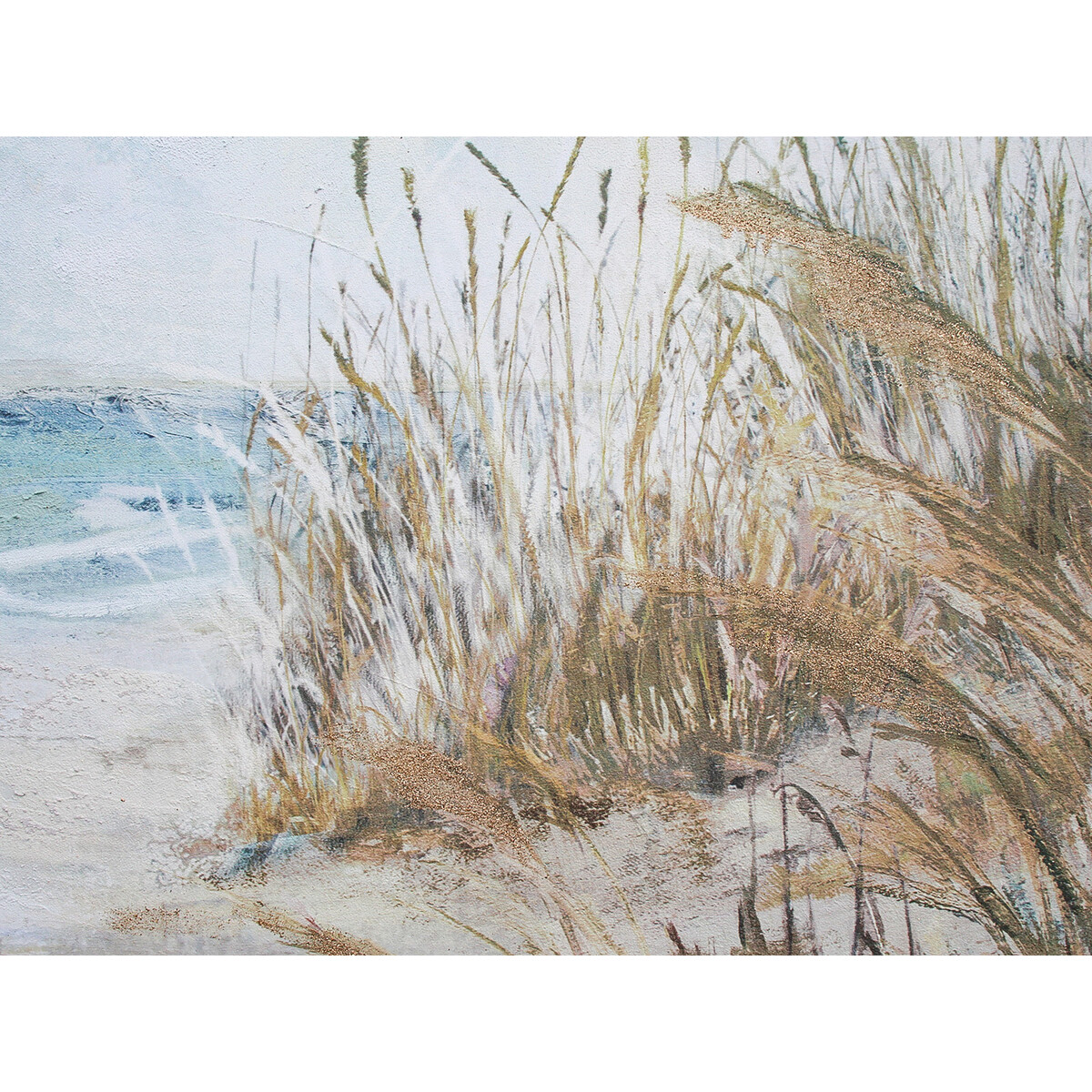 It is easy to begin your décor theme when you have great art on the walls. They give your ideas a certain kind of anchoring and help centre the space with their presence. Here the soft colours bring alive the beach-subtle-a peep through the tall heather where in distance you can see the frothing waves. So calm and serene and yet there is a certain kind of energy that is visible there. Oil on canvas such as this always adds a charming natural softness that such themes bring and at the same time give a deep dimensionality to the space. The canvas being 10 cm in height and 90 cm in width is almost square and thus would handsomely fit on to walls that are large-perhaps behind the large couch or the wall behind the console where you could place some shells and marine Knick knacks to give it company. Give your beachy décor the kind of centring and serenity it needs.