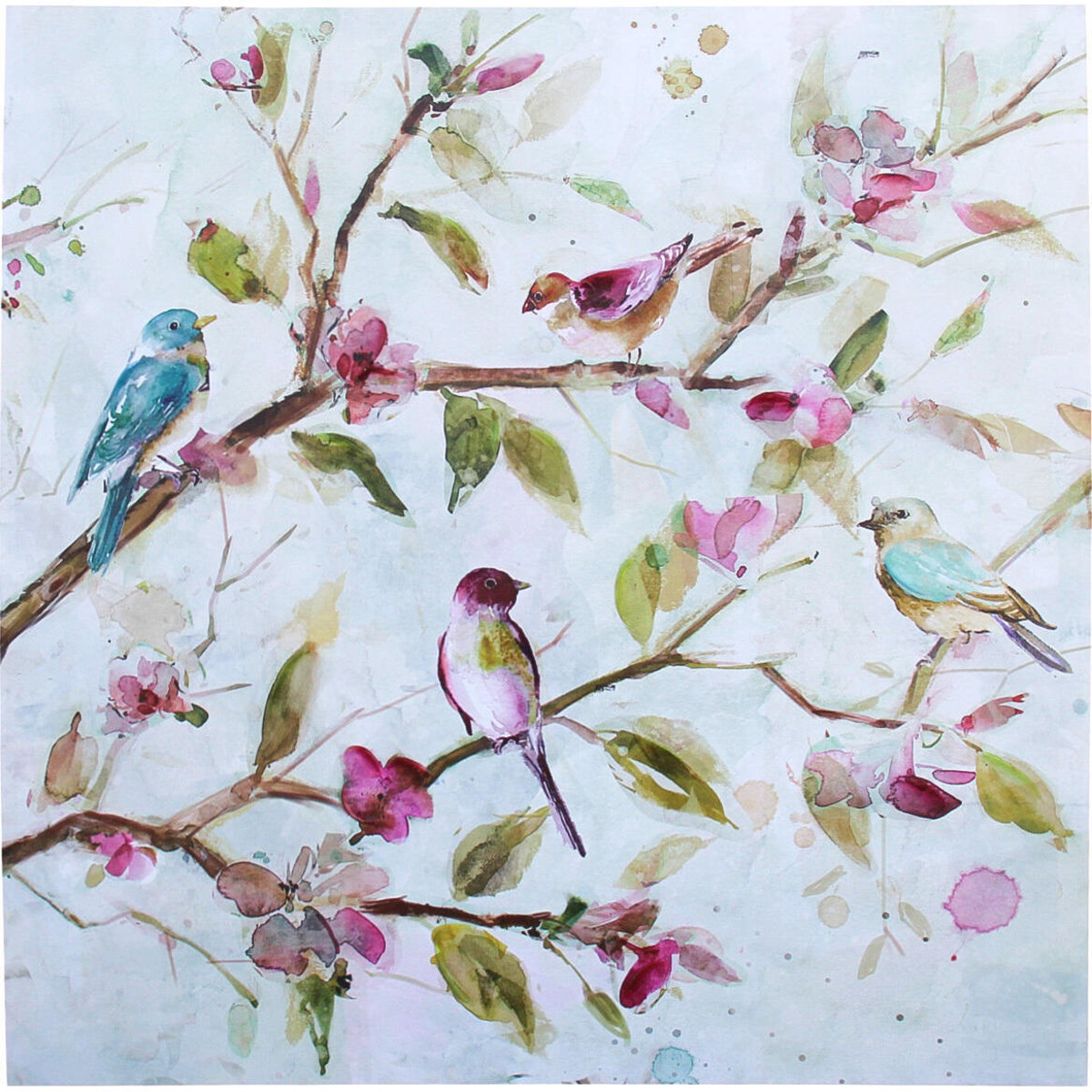 This contemporary and colourful painting of birds perched on branches of a tree with pink-hued flowers against a light blue background is eye-catching and lovely to gaze at. Its large pink blossom looks dainty and elegant as it plays home to the four small, brightly coloured birds and the art is printed using good quality inks to guarantee high definition and vivid colours. These cute birds with a happy verse will look great in the bedroom above the master bed or in the foyer of a home and will complement almost all interior aesthetics while adding depth to any space.