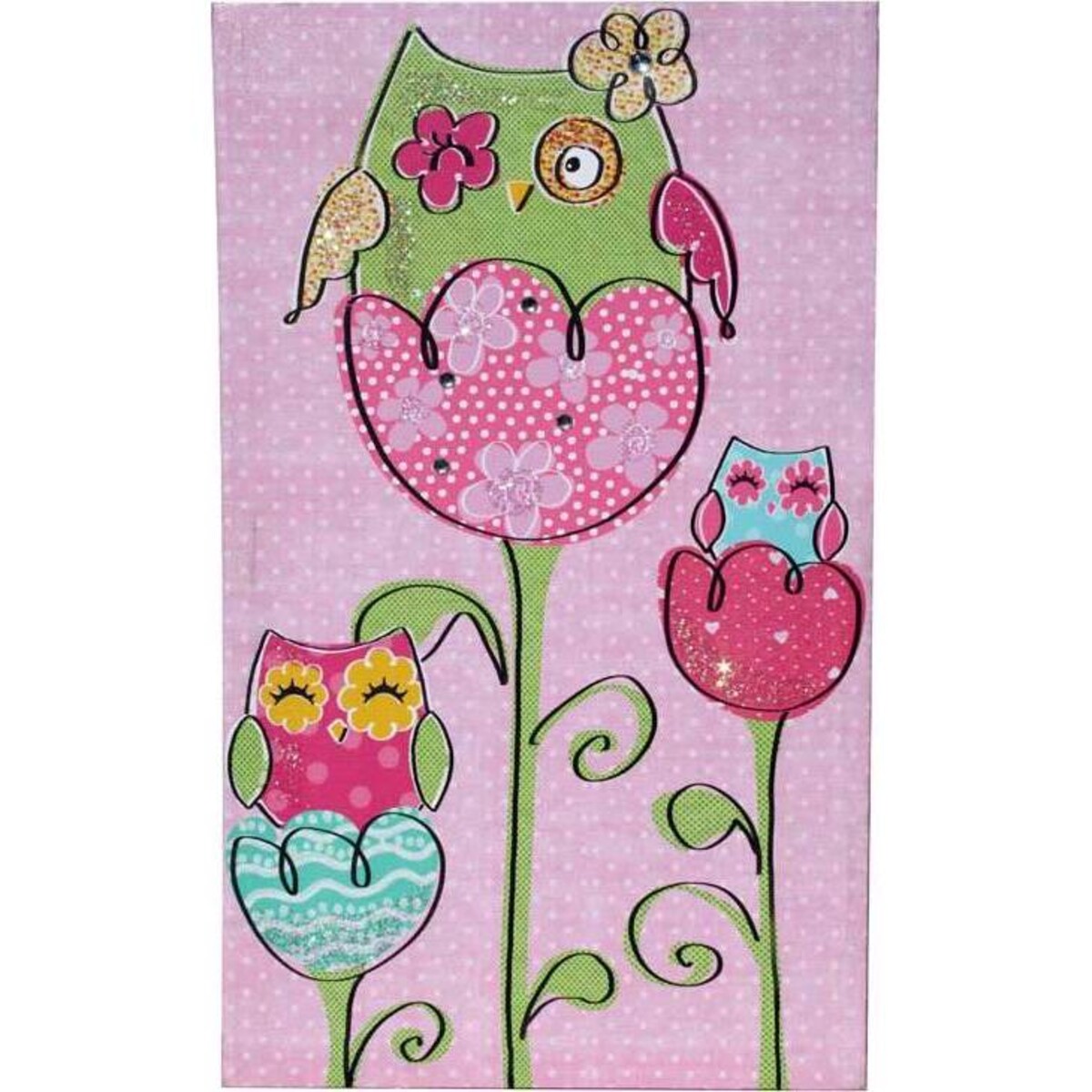 This vibrant and colourful piece of artwork features a large owl and two small ones, each of which that has their own special colour and design as they sit happily on flowers. Looking at their sweet expressions is sure to put a smile on your face, even during your worst days. This piece will make a lovely addition to any home, especially when put into a space that could use a big dose of colour. You'll wonder how you ever did without it for so long. Expect to receive a lot of compliments on this beautiful piece of art.