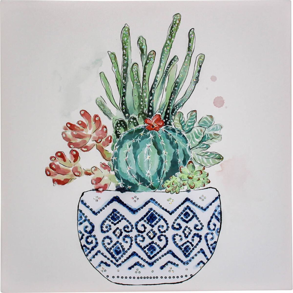 Did you know that cacti plants can live up to 200 years? This is because they have evolved certain strategies that allow them to adapt to their harsh environment. And they are loved for being good ornamental plants that doesn't require as much care as most other potted plants. The Canvas Cacti Pot 2 is a painting that testifies to the decorative brilliance that cacti plants and chic pots can have on any décor setting. The painting showcases at least two different species of cacti plant occupying the same bowl-like pot while there are reddish-pink blossoms blooming out of the cacti. The colourful design of the planter pot goes further to enrich the decorative ambiance of the cacti. This ingeniously painted art would make a brilliant wall décor that would enhance the ambiance of any room or office.