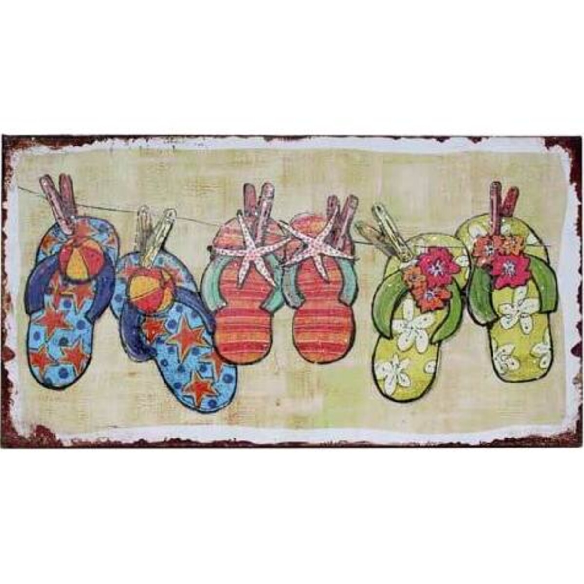 This beautiful artwork features three pairs of multi-pattern thong flip flops over a tan, white, and brown background. Each of the thongs are shown attached with clothes pins to a clothesline. Whether you keep this up in your home just during summer or you leave it up all year round as a reminder that summer is not far off, it's going to be a great way to add some colour to your space without going overboard.