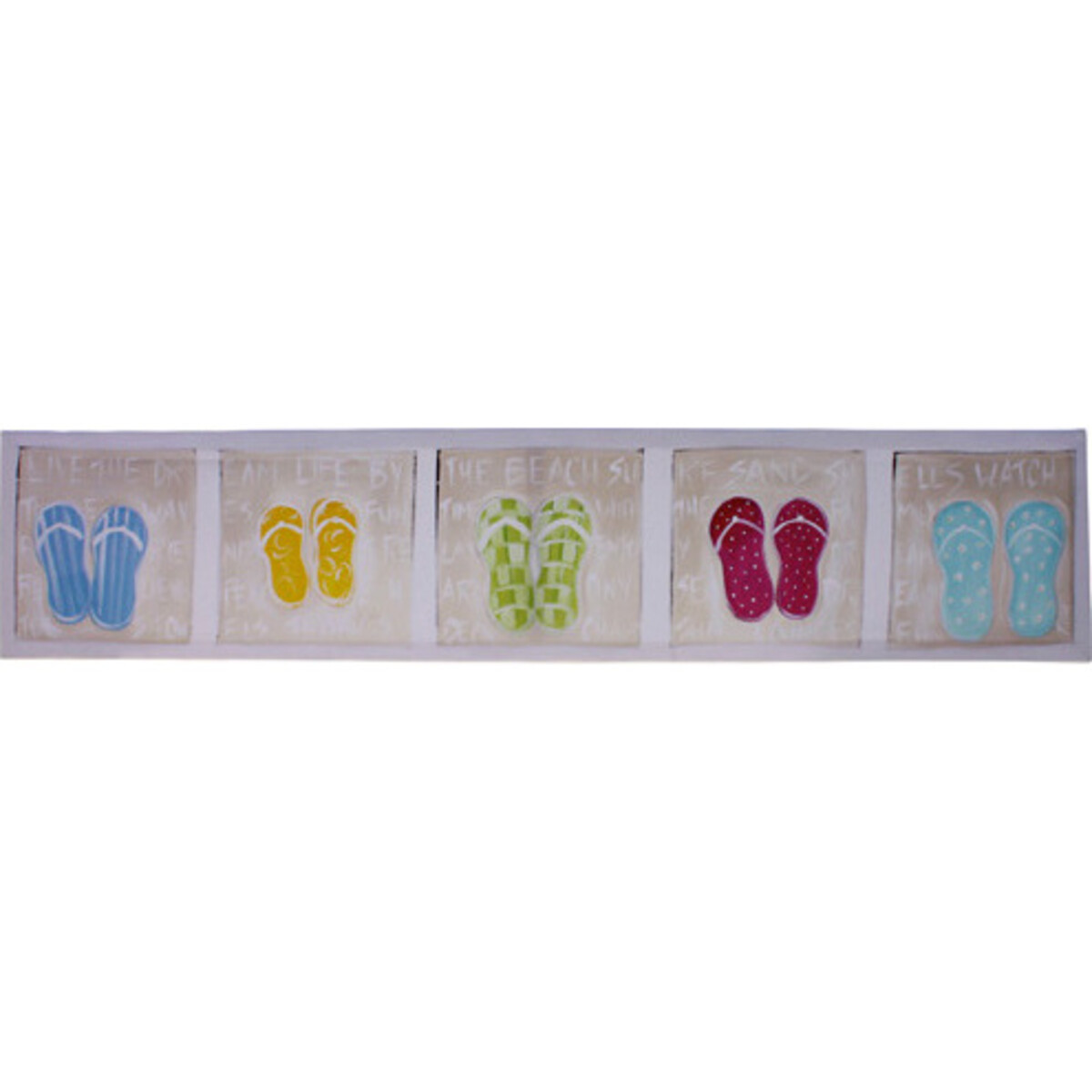The Canvass Colored Thongs is a fine wall décor that features the artistry of the Beach Art Specialist that made it. Like the other works of the artist, this work of art maximizes use of pastel and earthy colours executed in a whimsical style of drawing.