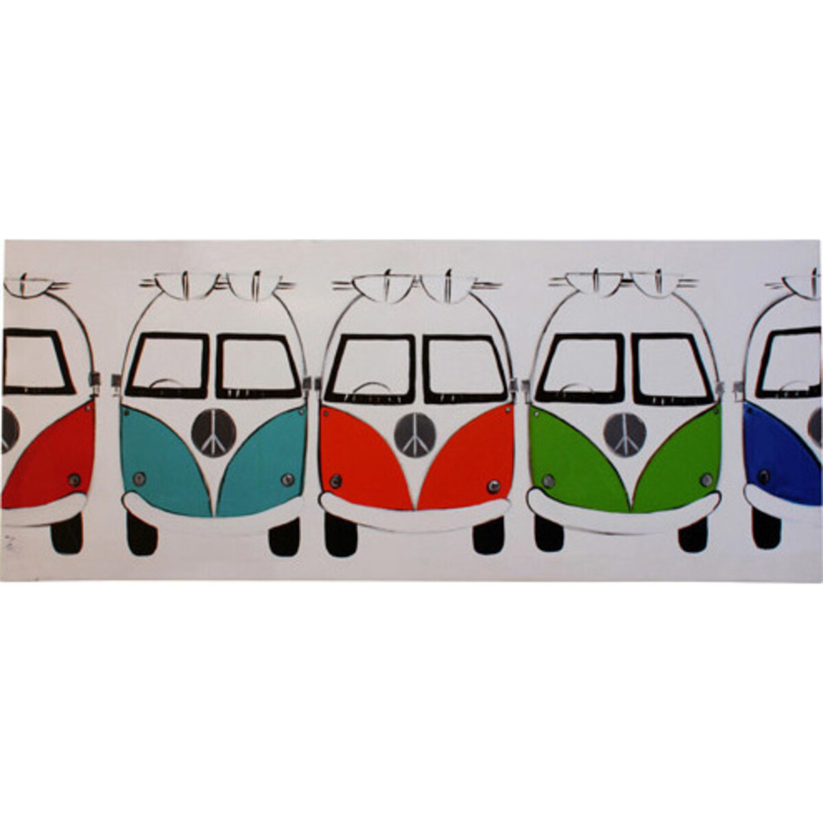 The drawing features a number of classic Volkswagen vans lined together horizontally. Also, the vans on the left and the right side are shown only in half - an ingenious technique that effectively creates a sense of 'continuity'. Also, the absence of any visible frame or borderline creates an 'oil paint canvas' effect.