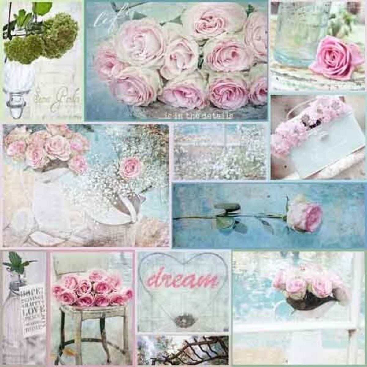 The canvas displays different pictures of pink roses set on simple stands, clear bottles with notes, vases and many others. It has a faded effect that adds a rich texture to the whole image.