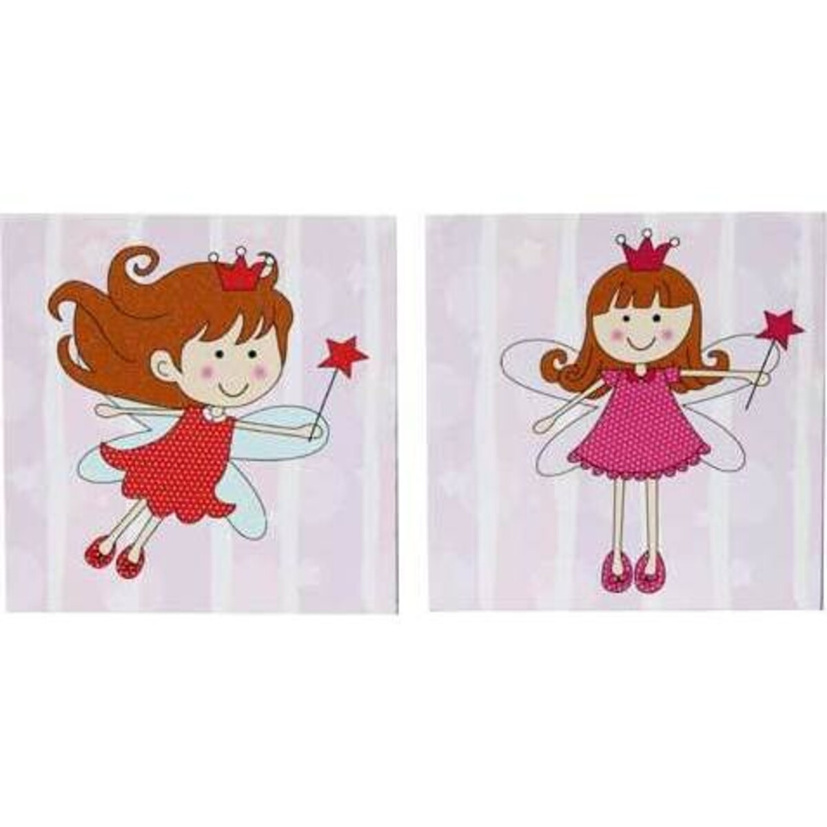 This pretty canvas set will be a very popular with young children, and especially girls. The fairies are superbly characterised with smiling faces against a delicate blue backdrop. One flies in a red dress, the other hovers in pink. All the colours are feminine and dainty to make for a calming and heartwarming set of images that will be perfect for children's bedrooms or play areas. At 20 x 20 cm, the images are large enough to capture and hold the attention of children and impart a happy positive feeling, lifting the mood of a room. The colouring is soft, in keeping with many styles of room, and will not jar against other decorative items. Ideal to inspire good thoughts and to encourage kids to doze of to sleep with happy dreams, this canvas set is a marvellous addition to any parent's home.