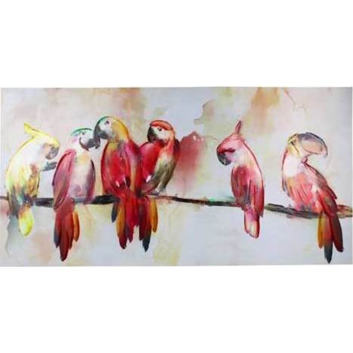 Birds on a wire - parakeets and toucans that seem to be oblivious to their beauty being as spectacular as has been depicted in this gel print on canvas. The myriad hues of their feathers look all the more vivid because the subtle printing technique of gel technology that gives colours and form a softer treatment making them blend in rather than retain sharpness which in turn makes the picture surreal.