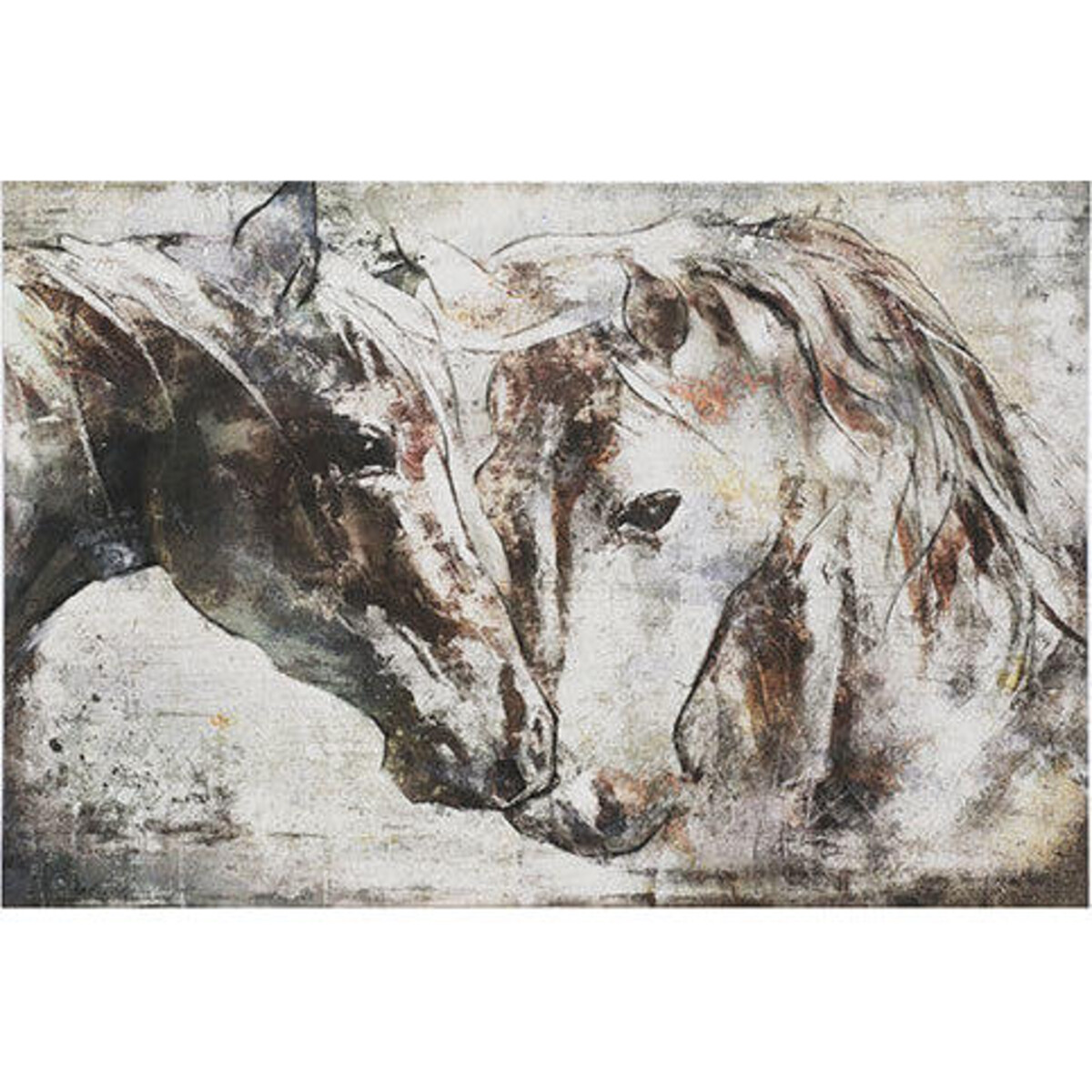 While the usual horse figures are strong and dramatic in form, it is the manner in which certain emotions can be transferred on to them, which could change their nature as in the case of this equine painting. The usage of the softest of colours, faintest of brush strokes and the simplest of techniques has rendered this image an organic freshness. The brushstrokes look incredibly fresh and real. The two heads of the horses bear perfect proportions. The canvas with its rather large size makes a huge impact as it is 120 cm in length and 80 cm in height. The beauty also likes in the shape, the head being the focus, the mane, the eyes and the tiny details of the structure comes into play with much precision and in all these counts the incredible beauty of form comes out a winner. The interplay of form with shades and very few colours adds further softness and charm to this image. A wonderful means to enhance the look of a space that need to build in a nature based theme or one that wishes to add a touch of emotional softness in an otherwise more staid and stiff environment.