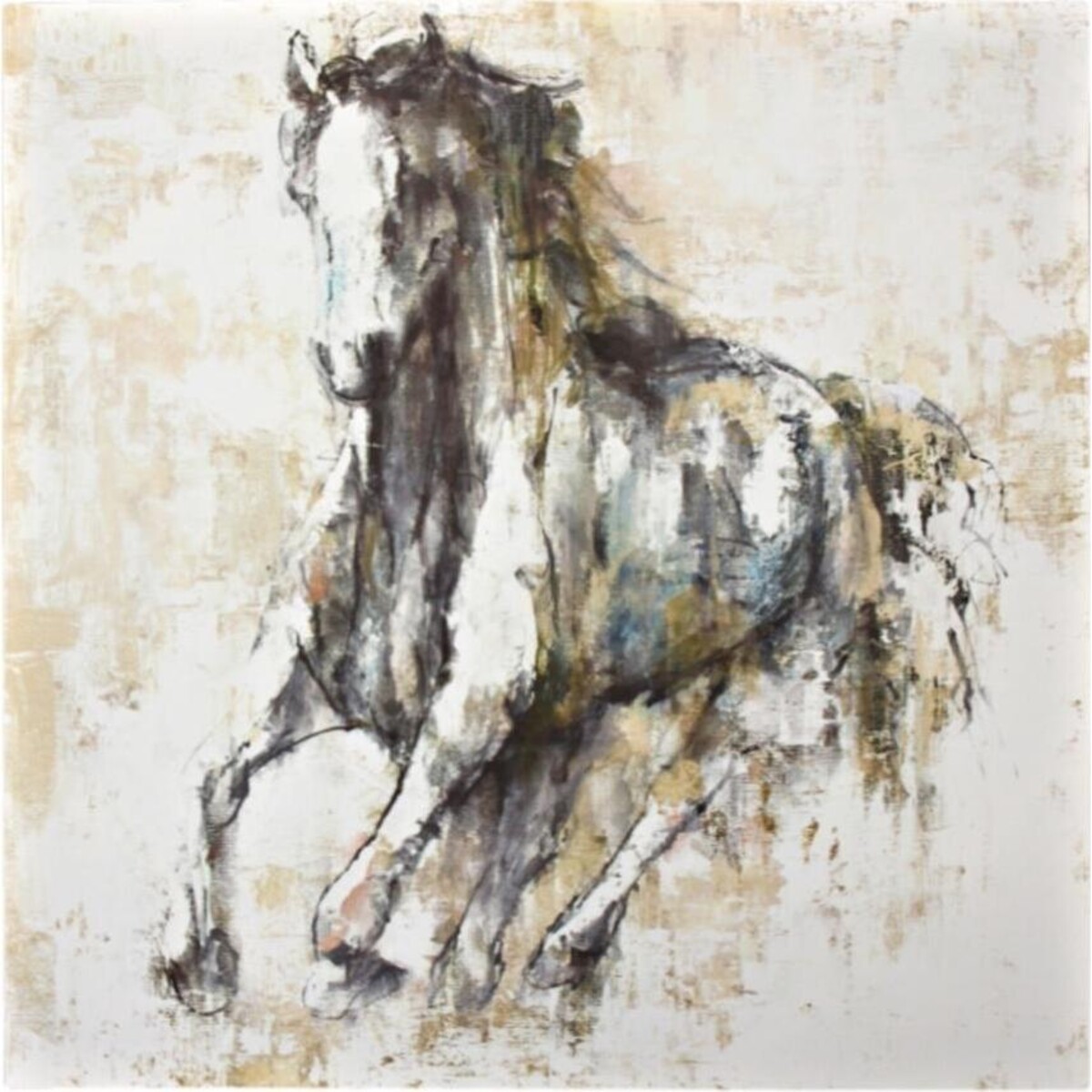 Adding art work makes your home gain look of great personality. The usage of colours, shapes and form, adds a certain centring thematically and in terms of colour palette and this painting on canvas is not any different. The stunning image of a horse caught in its powerful gallop, is a befitting manner of adding the look of strength and beauty to your space. Add this to the main wall in the living room or any such place that needs a focal point or a livening up-the canvas being replete with colours and an energy its own, it is bound to add the same to the surrounding. The easy to place on the wall feature would be suited to any room of your home. Be it the wall right above the main sofa, the wall above the sideboard or console or above the bed-they all will revel in the beauty of this stunning piece. The usage of neutral shades like ivory and greys have also made it suitable for any kind of pre-existing colour palette that may have been in use. The square canvas is 80 cm in dimension and thus suited to all medium sized wall spaces.