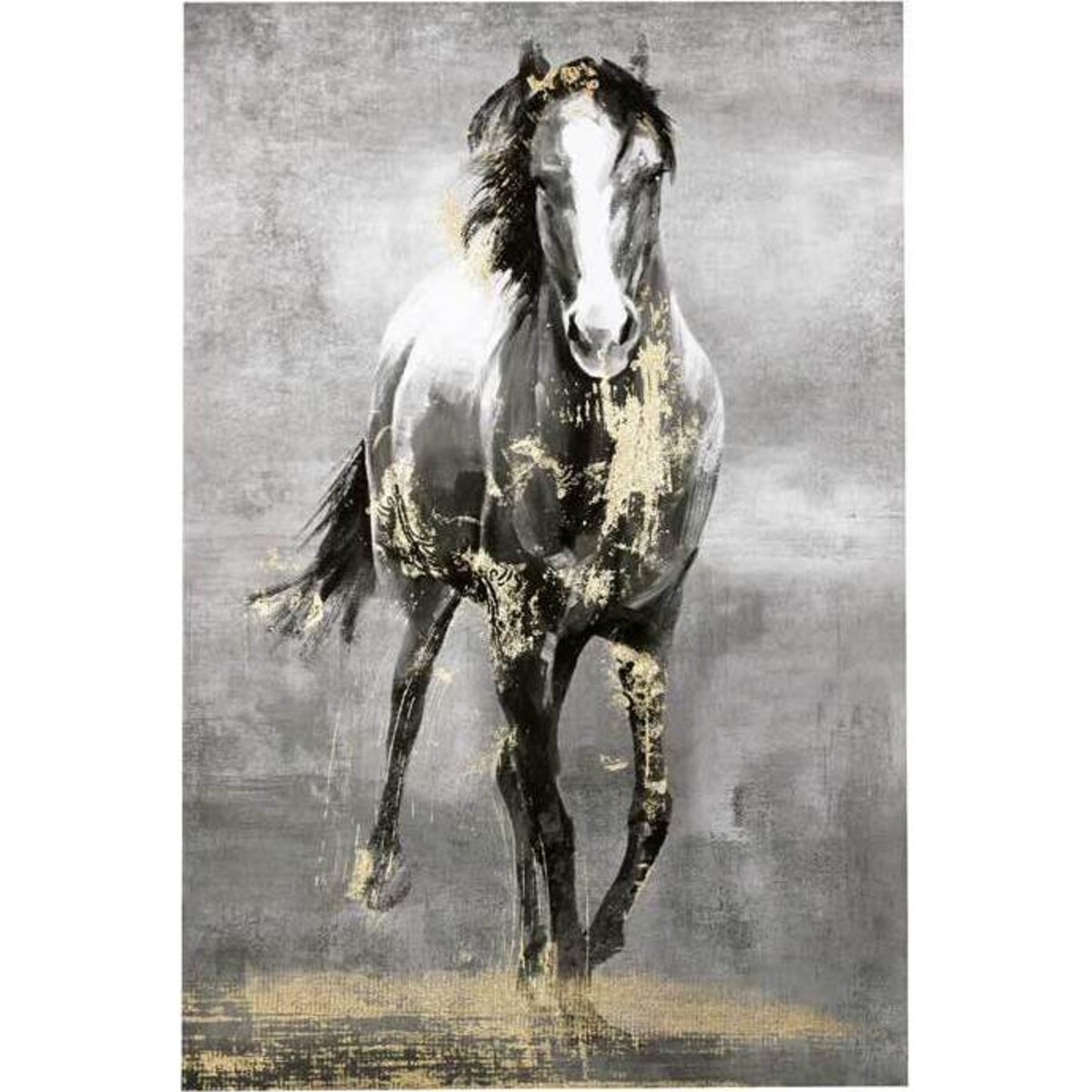 Equestrian themed art possesses and always invoke a sense of strength and character, endowing the image own natural grace. This canvas with it its dull foil highlight is a masterpiece in the usage of depth through tonality and usage of different mediums to bring out the wonderful form of the steed, its sinews, the flying mane and the swishing tail. The canvas will catch the light in places where the foil imprint is bolder than the rest of the colours. The woody tones, the tonal glow, the darker hue of the brush strokes that denote a certain eye on detail and the manner in which the canvas creates motion in it stillness is truly unique. An imprint of class and sophistication can be added to any space with this one of a kind canvas with foil detail art piece.