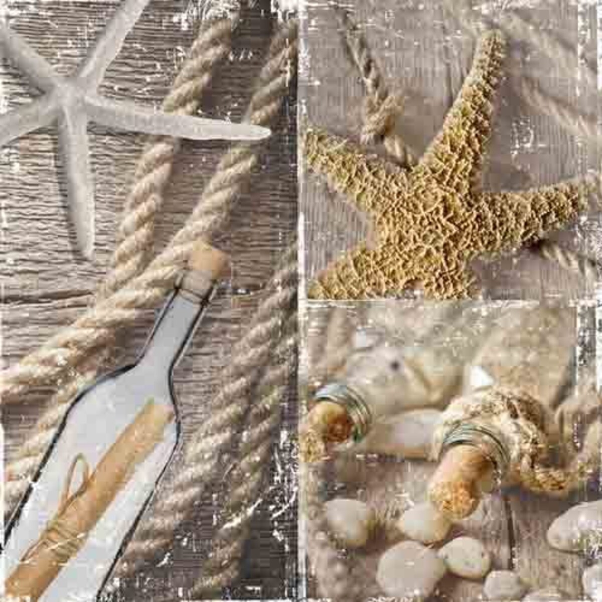 The canvas displays a well coordinated mixture of different shades of brown. It is divided into three sections, two of which shows a rolled up parchment inside a glass bottle, and one which shows an almost realistic brown starfish.