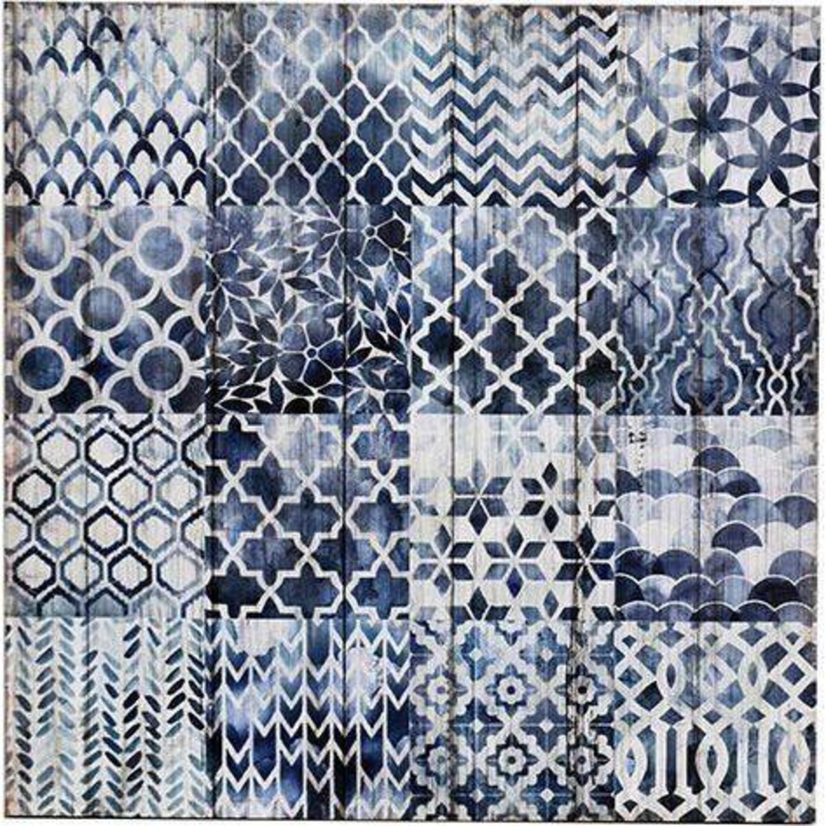 A bohemian look at art - this collection of prints in blue give the impression of a preexisting pattern that have all been combined to create a larger truth - of there being a repetitive and predictability in the unpredictable - a confluence of patterns known yet while coming together they create something quite new and unseen. The challenge thereby in abstract forms lies in the uniqueness of vision and that has been beautifully created with simple tile patterns that have been taken from traditional designs in blue and white carrying an imprint of the past. Use this to fuse your décor with art in a simple sort of way without upsetting the pre existing thematic. Any wall that needs to have its own kind of look without jostling for too much of attention can with display this design whose patterns will create a defined look that is riveting in its simplicity. It is a square canvas with 80 cm dimensions.