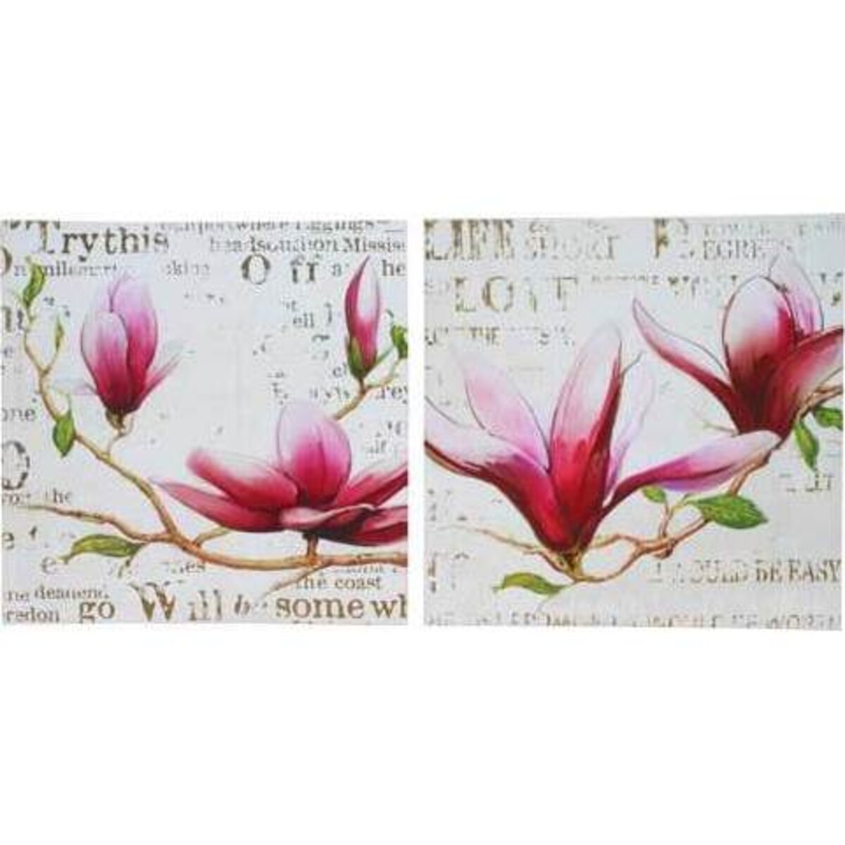 These matching magnolia prints are a beautiful and ornate wall piece that are a terrific blend of simplicity and visual complexity that will add something special and unique to an otherwise bare wall. Each of these wall hangings feature magnolias in differing stages of bloom floating over a white background with brown lettering peeking through. The lettering includes inspirational and uplifting phrases that will no doubt inspire the individual observing them. Phrases include ?try this?, ?life is too short?, ?love? and many more. Observers will enjoy spending time trying to decipher the lettering and phrases that feature behind the scenes of these budding magnolias. The brow lettering compliments the colour used for the branches, and despite all of the detail the wall art does not appear overly busy. At 60 x 60 centimetres each these wall hangings will need a big wall to be featured on.