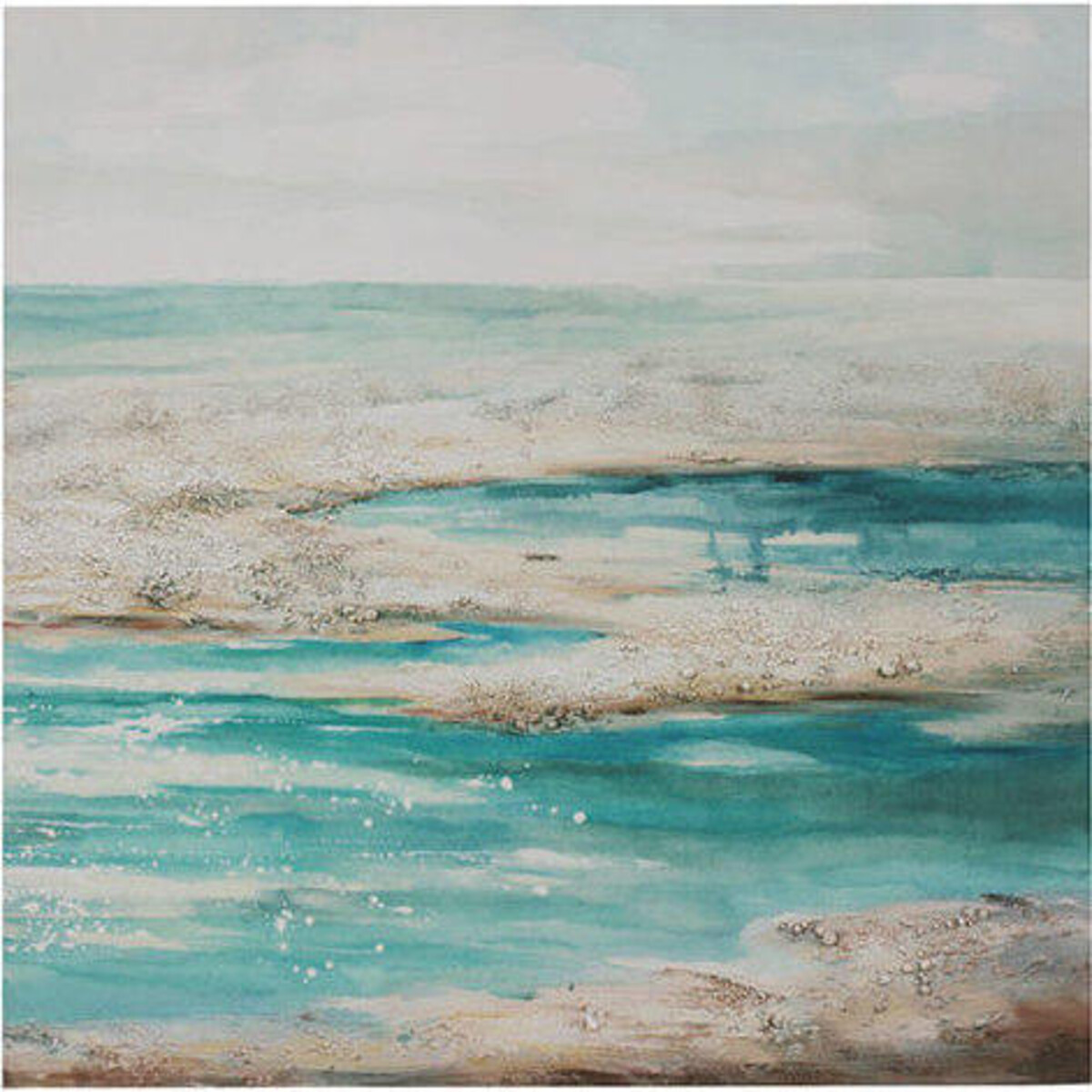 Lend your spaces the gorgeousness of the ocean with this simple inclusion on the wall. The print quite accurately uses the multitudes of hues and shades of blue and white to create this image of a tiny lagoon like formation and the softness of the sand. The beiges, blues and whites dominate the palette and make the Quiet Ocean theme come alive with absolute perfection. You can almost hear the winds sing its marine song and the faraway ship hoot as it passes by - the salt kissed wind touches your face and the sand feels cool under your feet. All these sensorial delights seem to come alive with the help of this beautiful creation in print from Lavida. The canvas would look great behind the main couch or near the console or the sideboard. It is best appreciated from a distance so would also be great for long galleries where it could be added to the wall at its end. The square canvas will be your one huge accent that will make all else revolve around it.