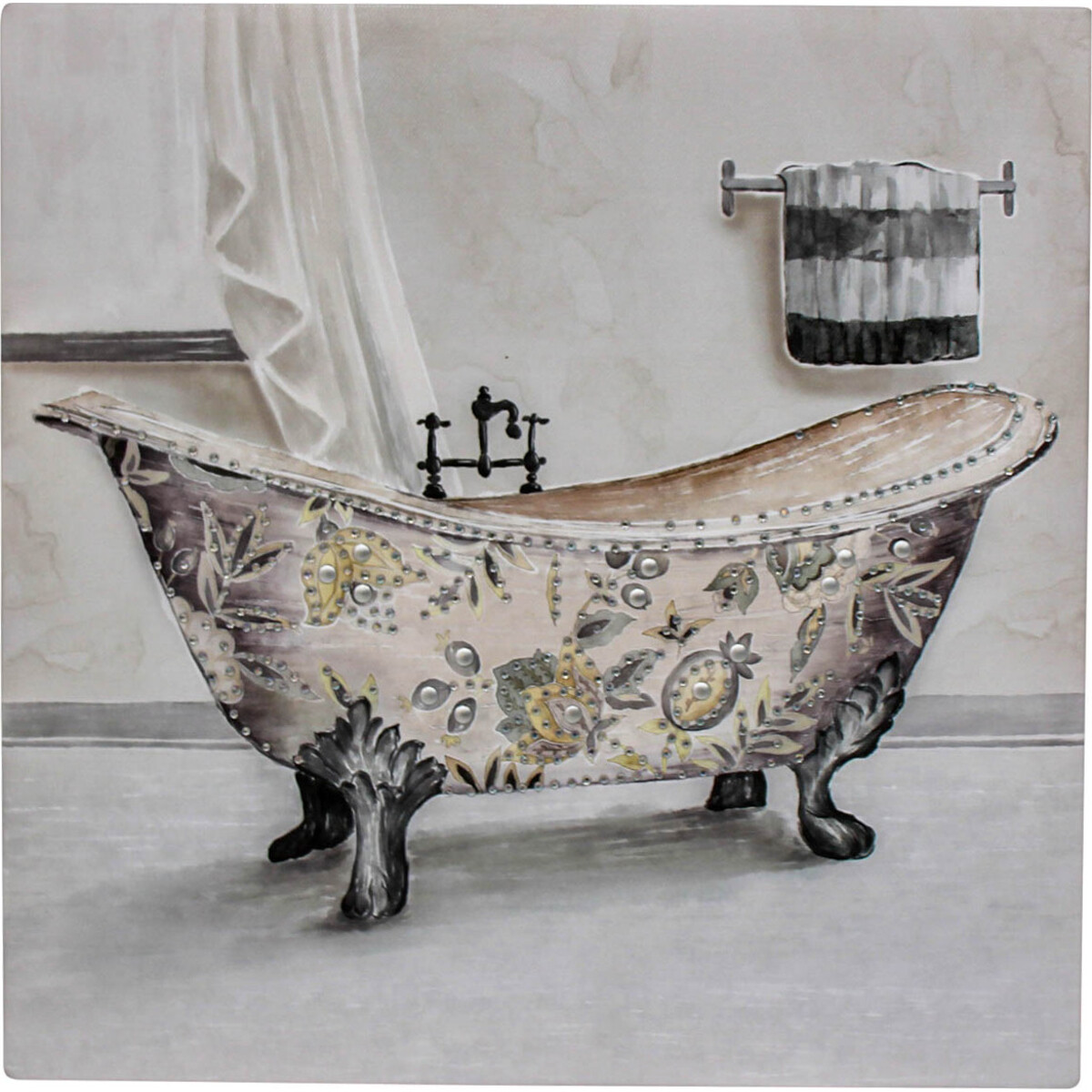 The Canvas Toilette 2 is a square shaped canvas painting that portrays the beautiful scene of a bathroom which contains amenities such as a drawn white curtain, a towel hanger with a black and white horizontally striped towel, and an ornately decorated bath tub. The bath tub is the focal point in the painting as it occupies the most room and has ornate decorations including floral patterns with silver coloured glittering stones. This particular painting would be perfect for establishments such as hotels, spas, motels and other such buildings with convenience facilities. The choice of light palette gives it an air of tranquillity. There are 18 of these paintings in every carton you order today.