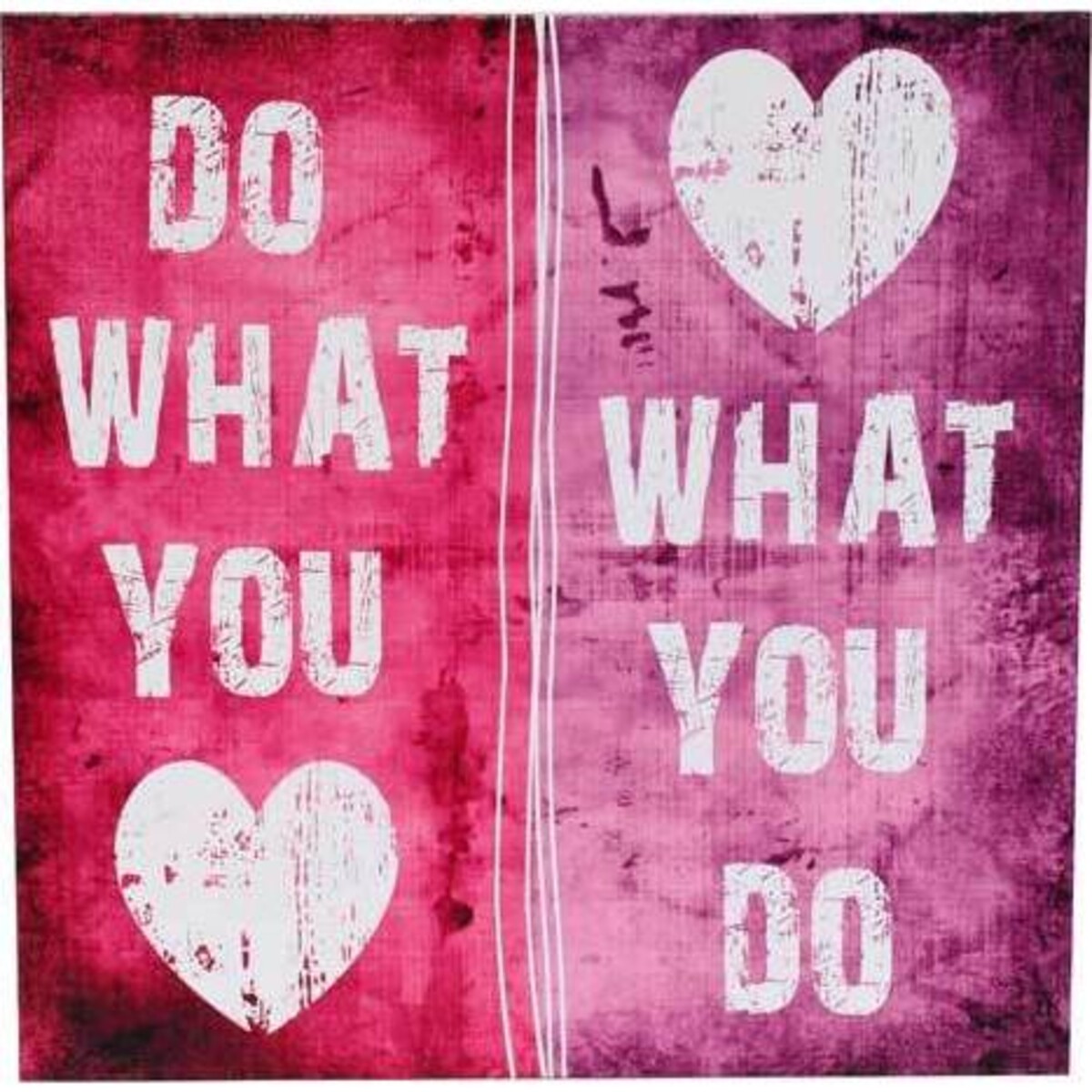 Horizontally split into two distinct sections, this vibrant canvas has a bold look and equally bold message. Urging viewers to take good advice - maybe something that hadn't occurred to them before - to embrace a passion and love it. Its evocative crimson and red colouring demands attention, but also has a softer, more romantic, subtext. This canvas could perhaps be a gift for a loved one who is looking to break into a new line of work, or to take up a different pastime. The message and images are wholly positive, uplifting, and will therefore appeal to people of any age. The picture, with its white text and heart shapes, is rustic in design and not overly formal - hard lines are excluded, adding to its warmth and ambience. A prominent and artistically elegant canvas, the design of which, will suit many dynamic environments.