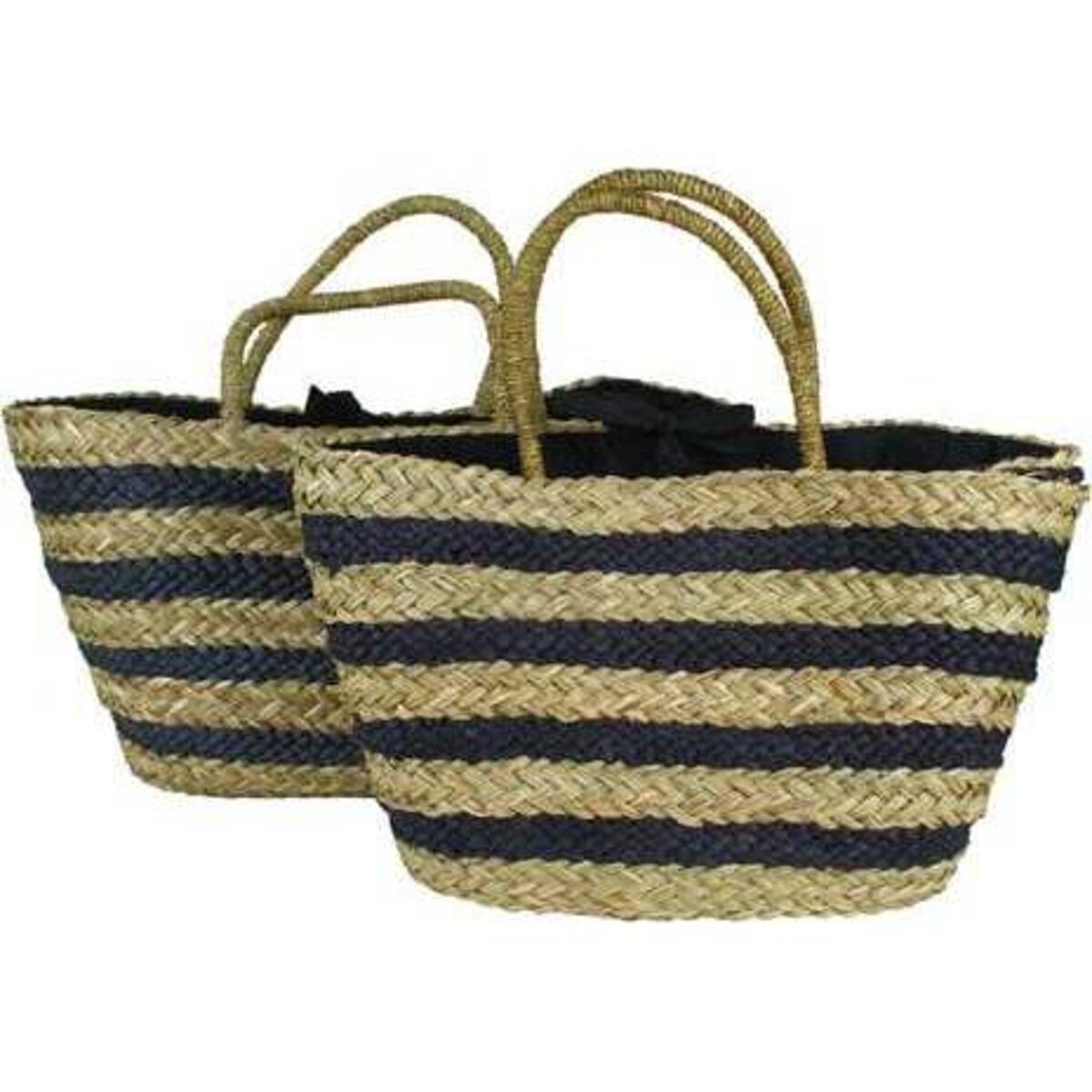 The black stripes Flojo sea grass set of bags is a one of a kind which enables the user to utilize it in a variety of ways. The sturdy and close set weave gives strength and reliability to be able to carry heavy weights as well as to carry large volumes. The size at 70 cm in length and 42 cm in width enables the user to consider it for usage as a day bag for taking to the beach or for a day long shopping so as to carry back large volumes of things. It's a wonderfully styled set of bags that will look great with all kinds of outfits. The inner lining matches the colour outside and the closing with a tie up strap adds more charm to its most natural and organic design. The supple strength of the bags will allow carrying heavier loads with ease and its handling is equally easy as its longish handles will be easy to grasp and sling on the shoulder. The traditional art of basket weaving has certainly been taken notches higher in this offering from Lavida where practicality, conventional sensibility and good taste have all come together for a great product.