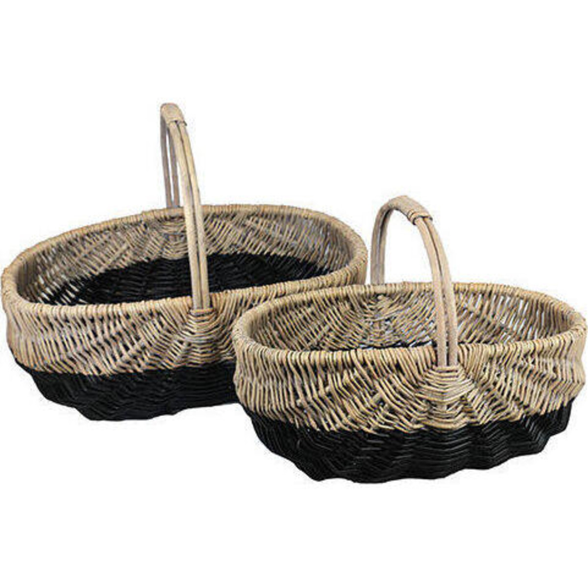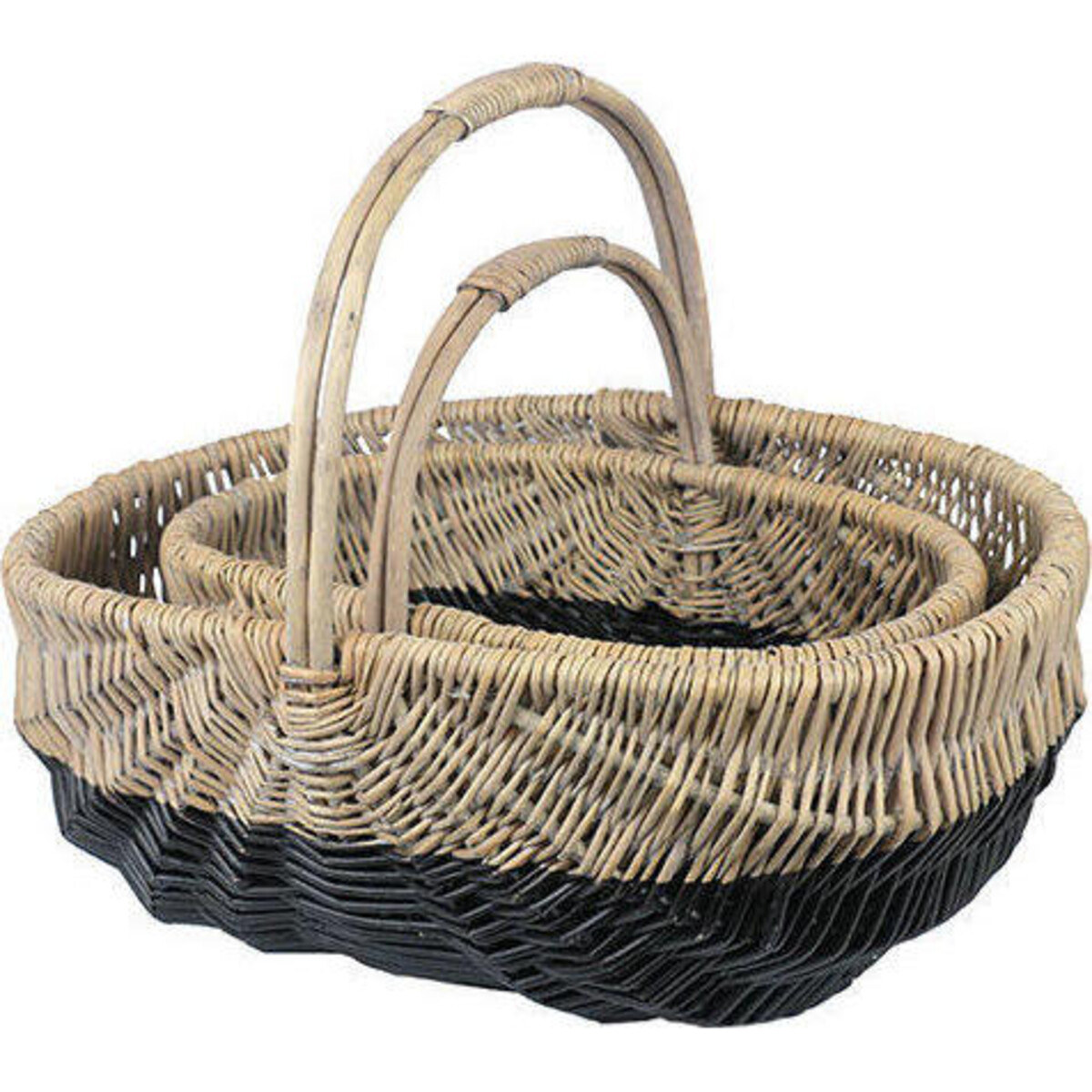 Carry with ease things that you need from the garden or the market. Structured with high quality rattan, woven with a dense kind of weave that gives the basket a sturdy yet lightweight structure makes them ideal for your shopping trips. The dual tone adds a design detail that makes it seem more flamboyant than simple. Add the touch of farm and country to the way you not just shop but also lace fruits and vegetables in your kitchen as these baskets when not out shopping with you are great organizers too. The well - crafted weave, the superb manner in which the baskets have been given easy to use handles and the space between the handles and the lower body makes them an ideal choice for home use. The larger of the duo is 38 cm high with a 49 - cm length and adequately large depth. The smaller is 28 cm in height with a length of 41 cm allowing the two to nest into each other when not in use.