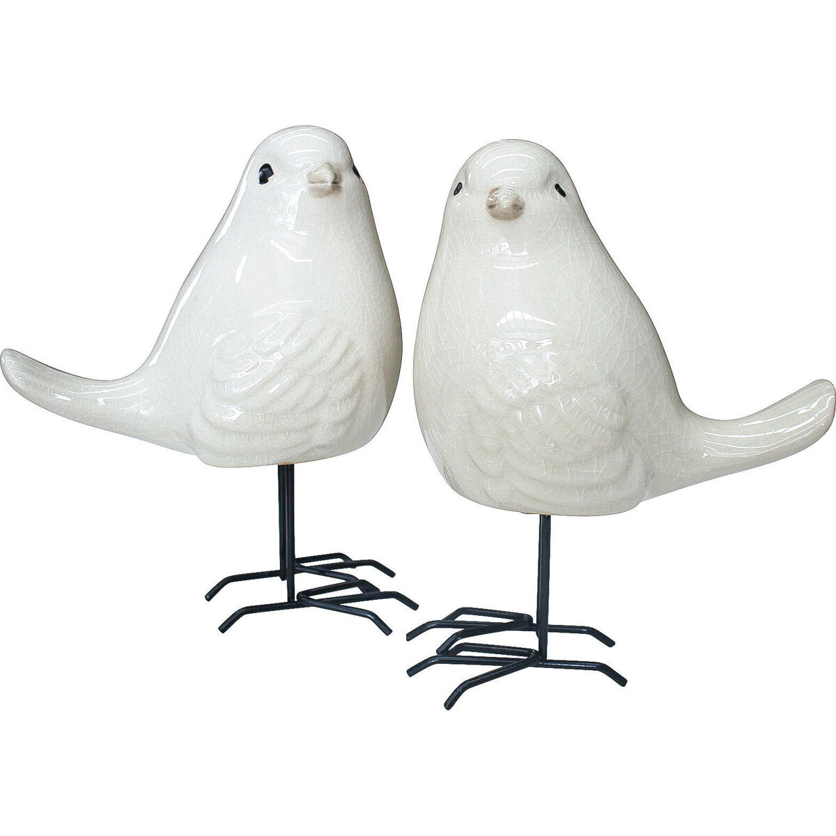 They are white, pert and created with much precision from ceramic. The metal legs they stand on give them that added contrast as the legs are dark and the body in pure white ceramic. The set shows off its high glaze expertly created using the perfect firing technique. For all who like the look of farm and country or for those who wish to build in a natural setting with green foliar, rugs in jute and a sparkling fresh interior where natural colours and palettes play a part this set of ceramic accents will liven up coffee tables consoles, sideboards or the mantle. Add a vase filled with fresh blooms and place it close to them -or simply place them atop your book shelf to take away its boredom-after all, what could be livelier than the energetic presence of birds and their noisy companion ship.