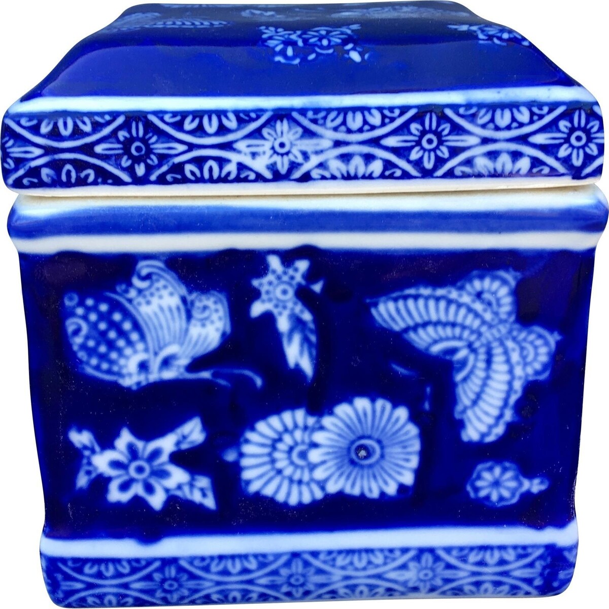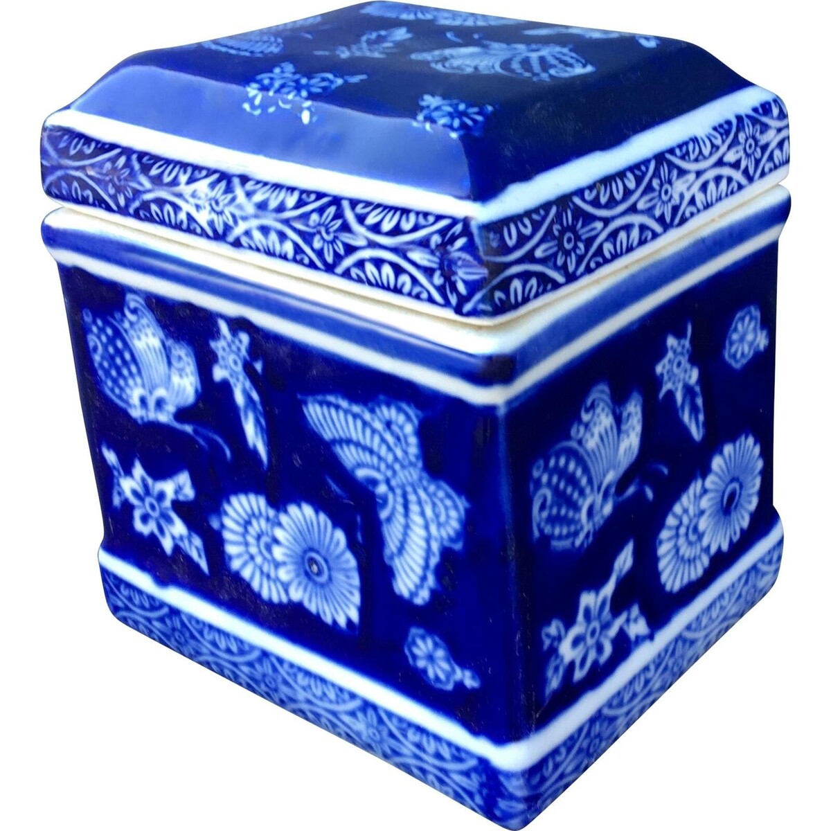 Add this ceramic made container to your dressing table and it would function splendid as a trinket case, or - add it to your coffee table and it could hold tea bags inn exotic flavours and make a wonderful splash of style while doing so. There are innumerable ways in which classic ceramic come into our interiors and can help enhance its beauty. Made for well fired porcelain, the high glaze proves the exquisite amounts if time and patience that has gone into creating this piece. The blue and white colours of course have remined one of classic choice and never fails to impress. The floral butterfly pattern and the border in a gorgeous design are highlights alongside the fact that the trunk like stature makes for a wonderful storage option for precious little possession as well. The height of the box is all of 12 cm while its length if 11.5 cm and a width of 6 cm, gives it a handsome proportion to come into play for all your trinket storage needs.