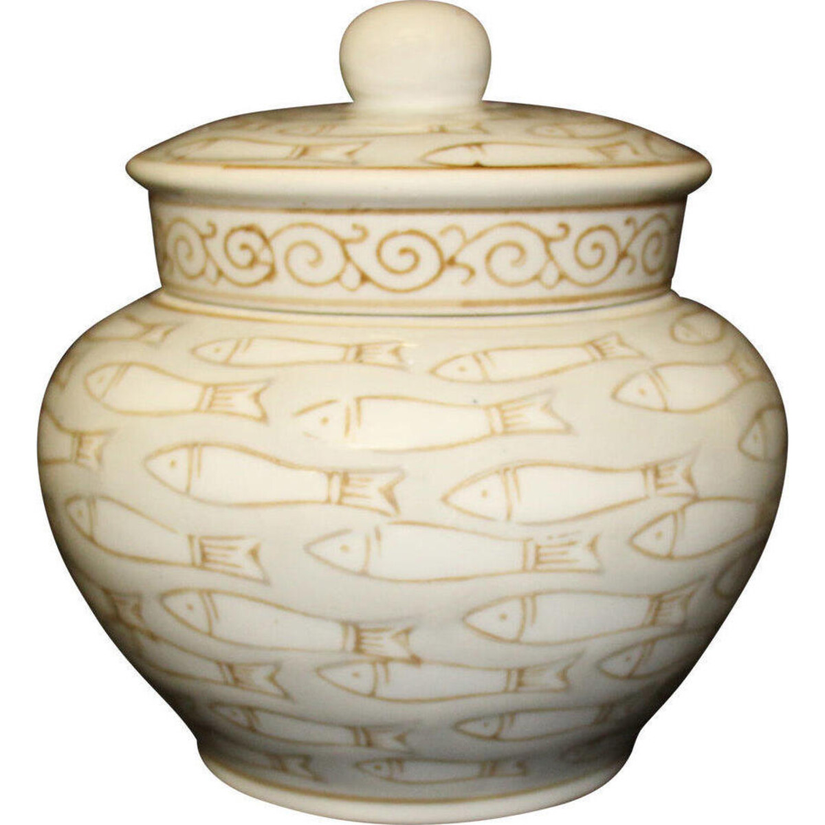The tiny fishes that seem to be encircling the roundness of the container add that touch of design in a delicate shade of beige and creamy white. The high glaze makes the container most suited for display - after all it is the result of years of expertise. The lid sits well on top and that makes this jar most suited for adding to your kitchen as well - perhaps with tea leaves in it or a fresh batch of cookies. Could be converted to a pair or a set as well. It has a height of 15 cm and its diameter is 14 cm with the width perfectly balancing it despite the small round base. The great thing about ceramic is the manner in which it builds in the feel of feel of vintage and classic appeal in one stroke. While on the other hand there is a farm and country feel from its unpretentious style and a certain understatement in terms of colour and form. A simple design that gets elevated to another level because of the finish of the jar. The lid can be held with ease and makes for a great design in terms of storage usability.