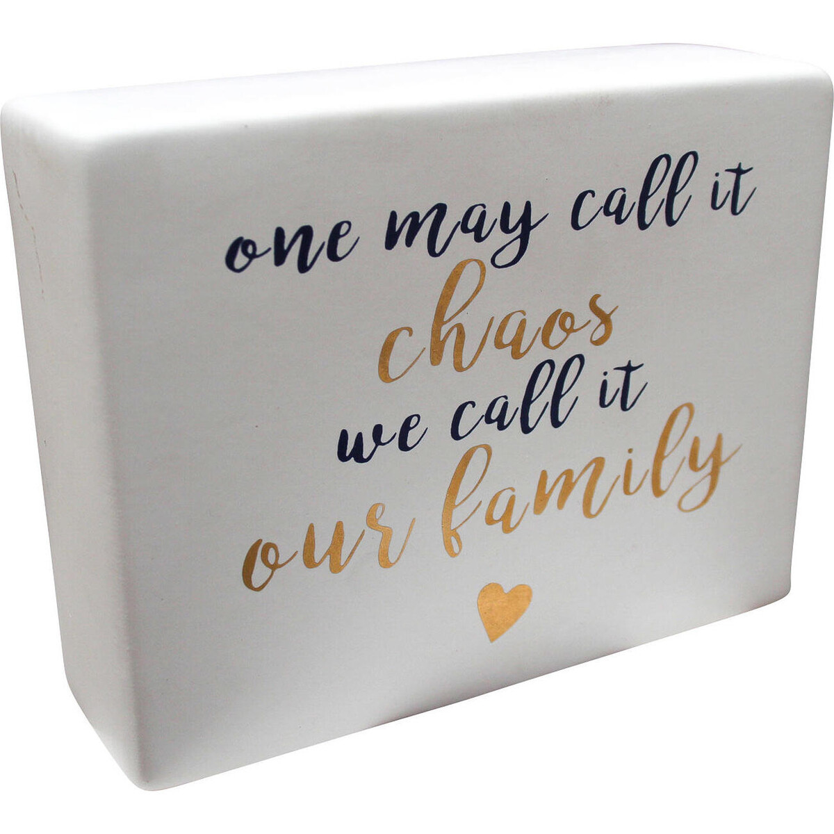 This Family Chaos ceramic sign is a great way to add a loving touch to a home or some motivational flair to an office desk! The chunky block design with a little heart at the bottom adds a familiar comfort and warmth, while the bold black and gold text adds a refreshing pop of chic style. Its neutral colour palette will work in any room. It also makes a lovely gift for friends and family coming holidays and can be personalized however you like. You may paint the backside with a family name and town or city.