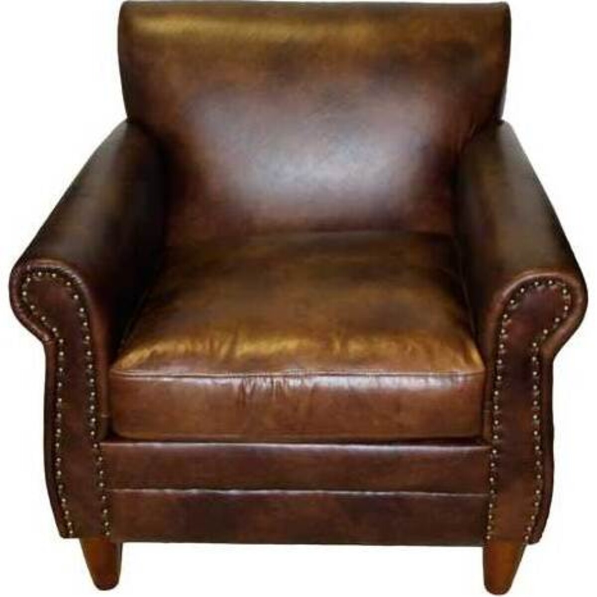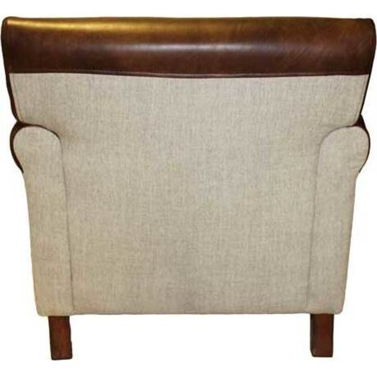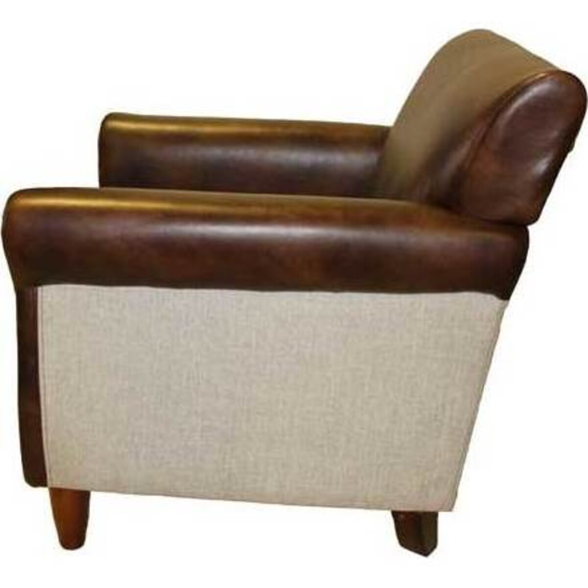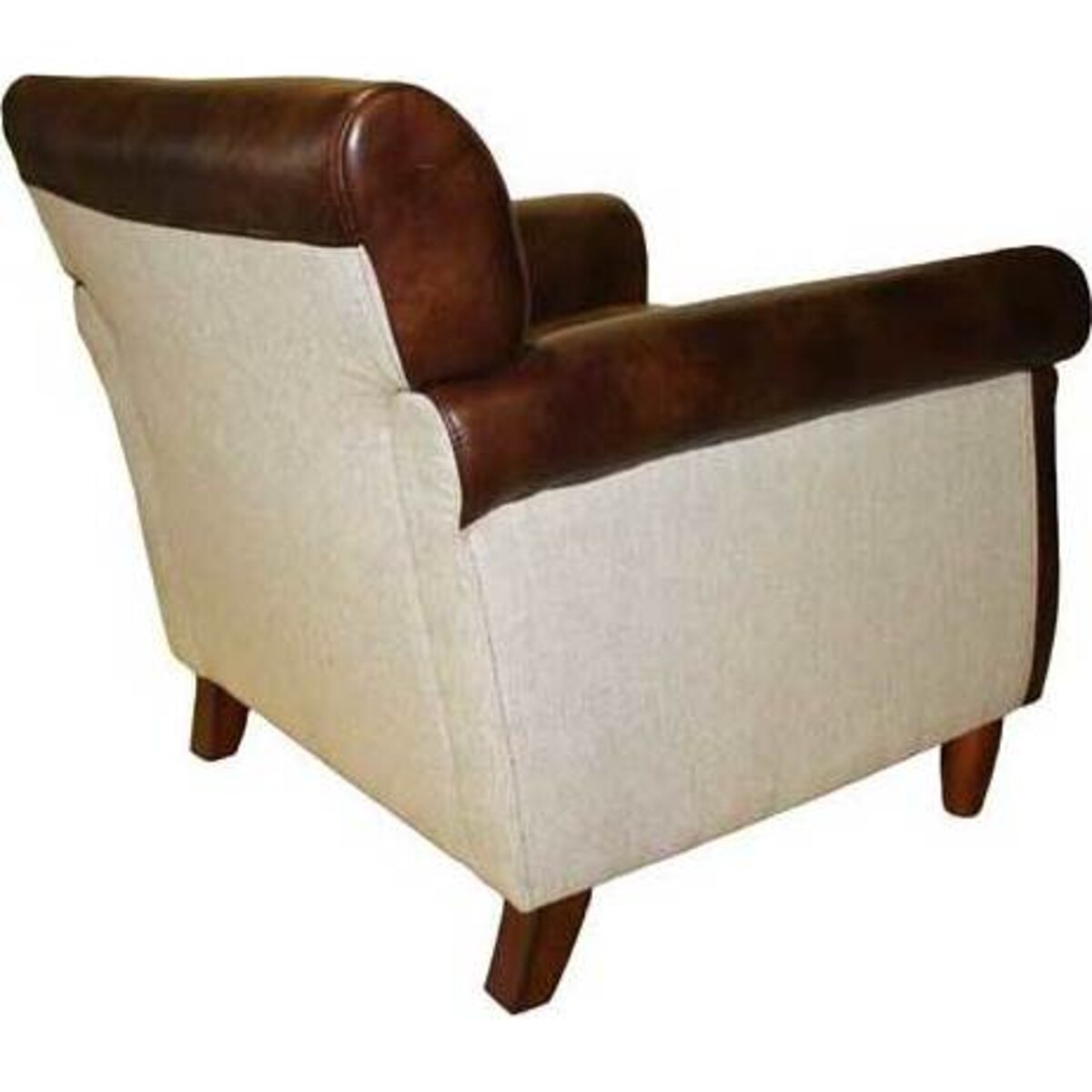 Your customers will be delighted to sink into this overstuffed brown leather and cream fabric armchair. Whether they want to enjoy a good book, catch up with the latest television or even just relax in the conservatory you can be sure that this armchair is the chair to do it all in. This classically styled leather chair looks as though it was hand built for a gentleman's study, although with the right decor this chair will work in a living room, an office or a bedroom. This delightful and luxurious armchair is upholstered in dignified deep brown leather held in place with sturdy brass rivets. The leather, if well maintained, is guaranteed to last for a number of years. Along the sides of the chair (under the arms) and around the back (under the head rest) the material changes to a stunning cream fabric which contrasts with and yet compliments the colour and texture of the leather perfectly.