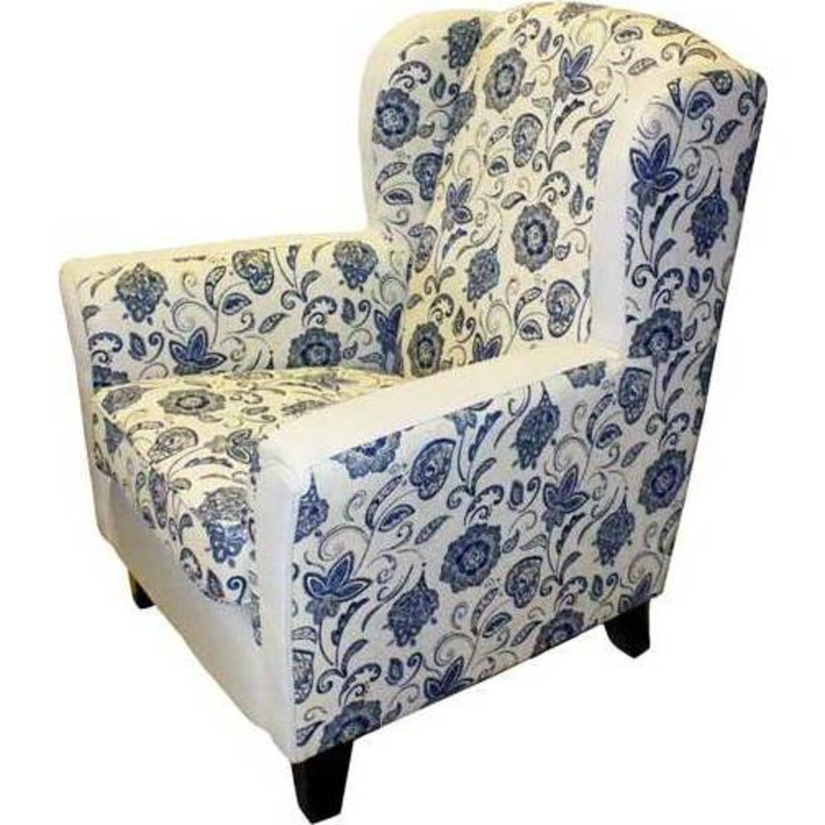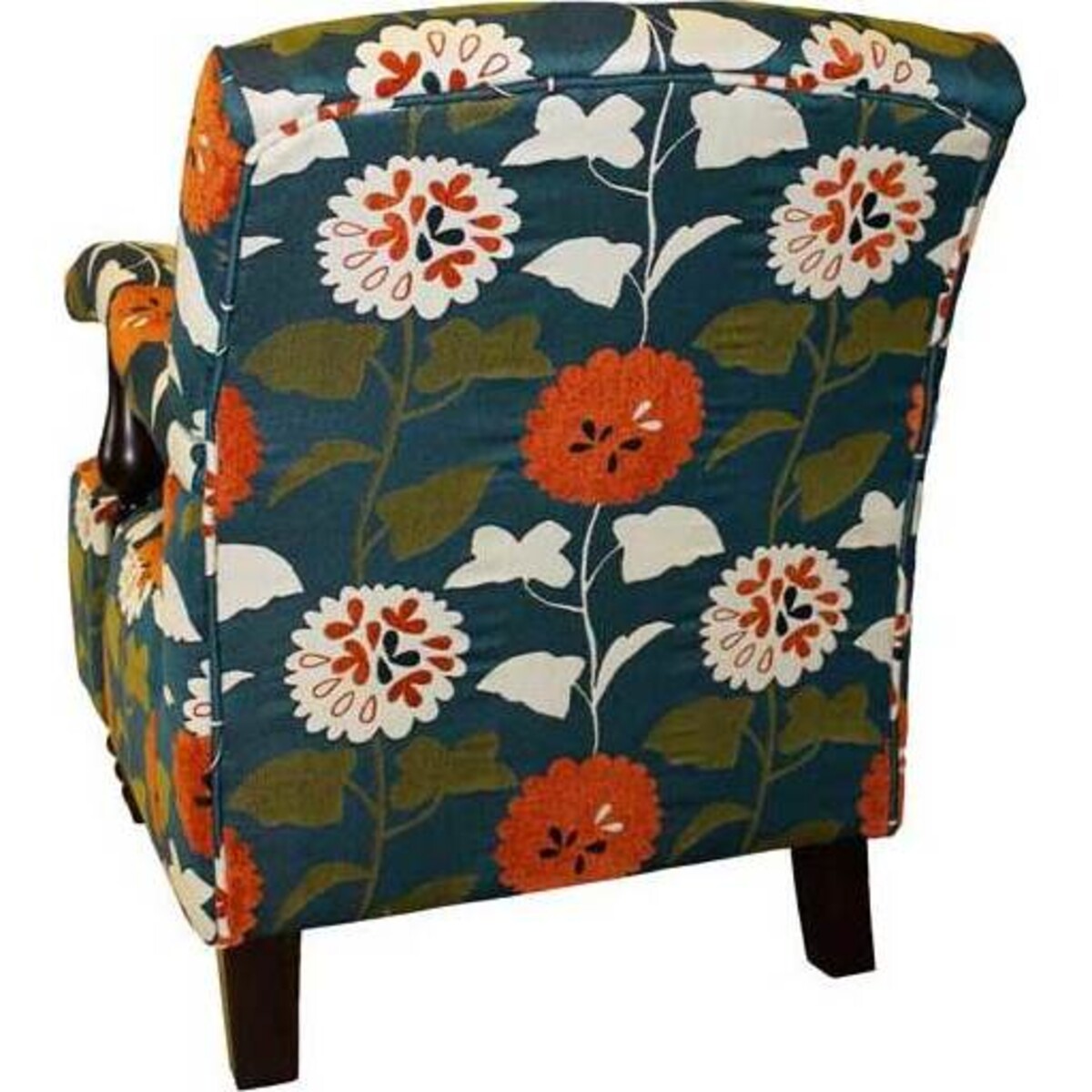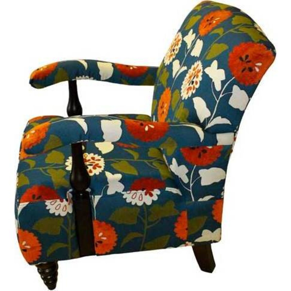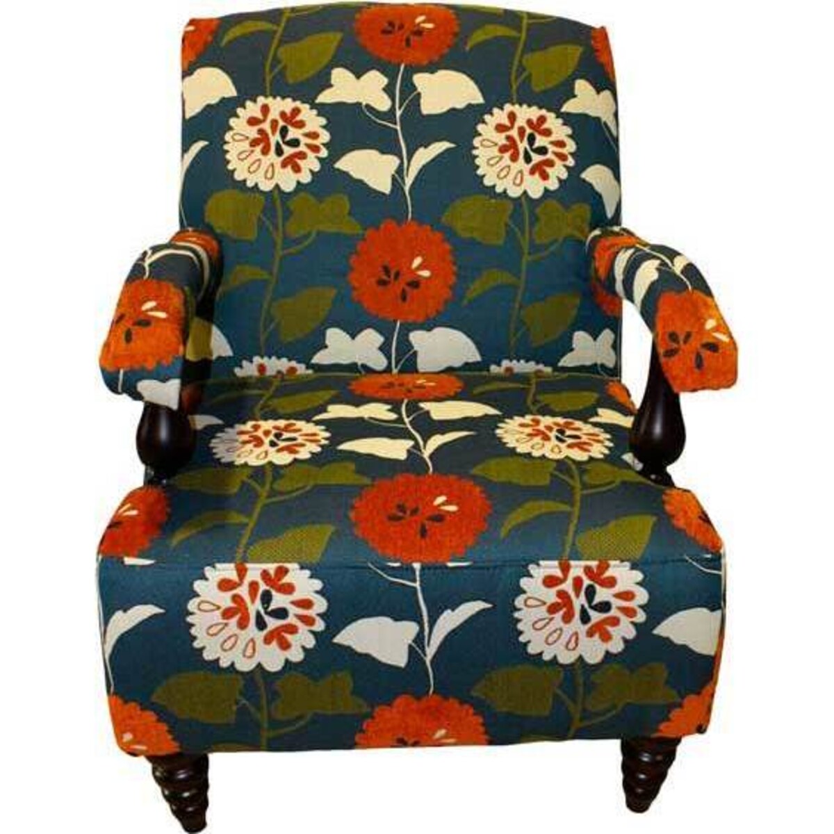 The Floreana chair features a stunning bold floral print on a deep blue background. This beautiful and highly comfortable chair is a great piece that will make a wonderful focal point in an otherwise neutral room. The fabric of the chair is adorned with big bold flowers, which includes vibrant reds, forest greens, and a crisp white. The bold print fabric is used throughout the chair, both front and back. This gorgeous seat includes arm rests and chair legs that are made from the same dark wood, and a similar design is adopted giving this chair a classical but very modern look and feel throughout. The padding on the seat is incredible, and will offer any homeowner (or guest) years of comfortable support. The design may feel like a 70?s throw back but the big bold prints are very much on trend and perfect as a centrepiece for any modern home.
