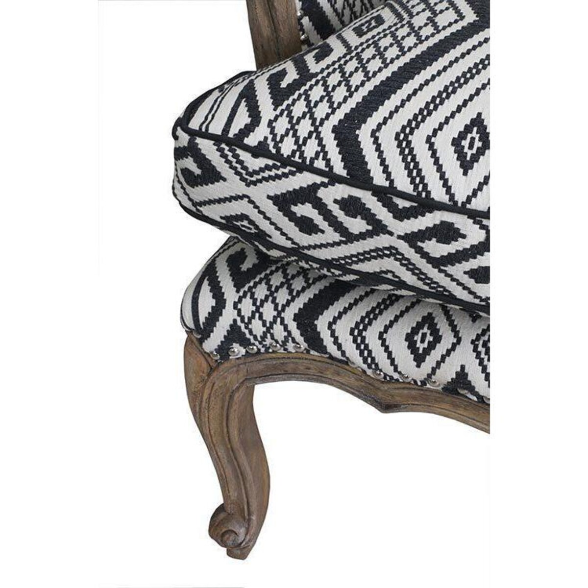 A beautifully finished piece that comes with sturdy wooden structure and a lovely design on the well chosen upholstery as it does complete justice to the manner in which the design and the structural design of the chair coordinate. The Chair Aztec has a heavily padded lower cushion which is removable but adds that plushness hat the chair inherently proposes for your seating. The Aztec pattern ads that element of drama that goes well with its gorgeous shaped back and the sturdy yet well designed ornate legs. An impressively regal and classic design that can be quite the showpiece to make your living room come alive with more vintage and heritage style. Also worth noting is the natural wood colour that has been retained and the handsome black back of the chair that makes it look all the more polished and well finished. The brass rivets and more of the hint of plushness. The height of the chair is 102 cm and its length and wood I around 70 cm. Large imposing and very luxurious in all senses.