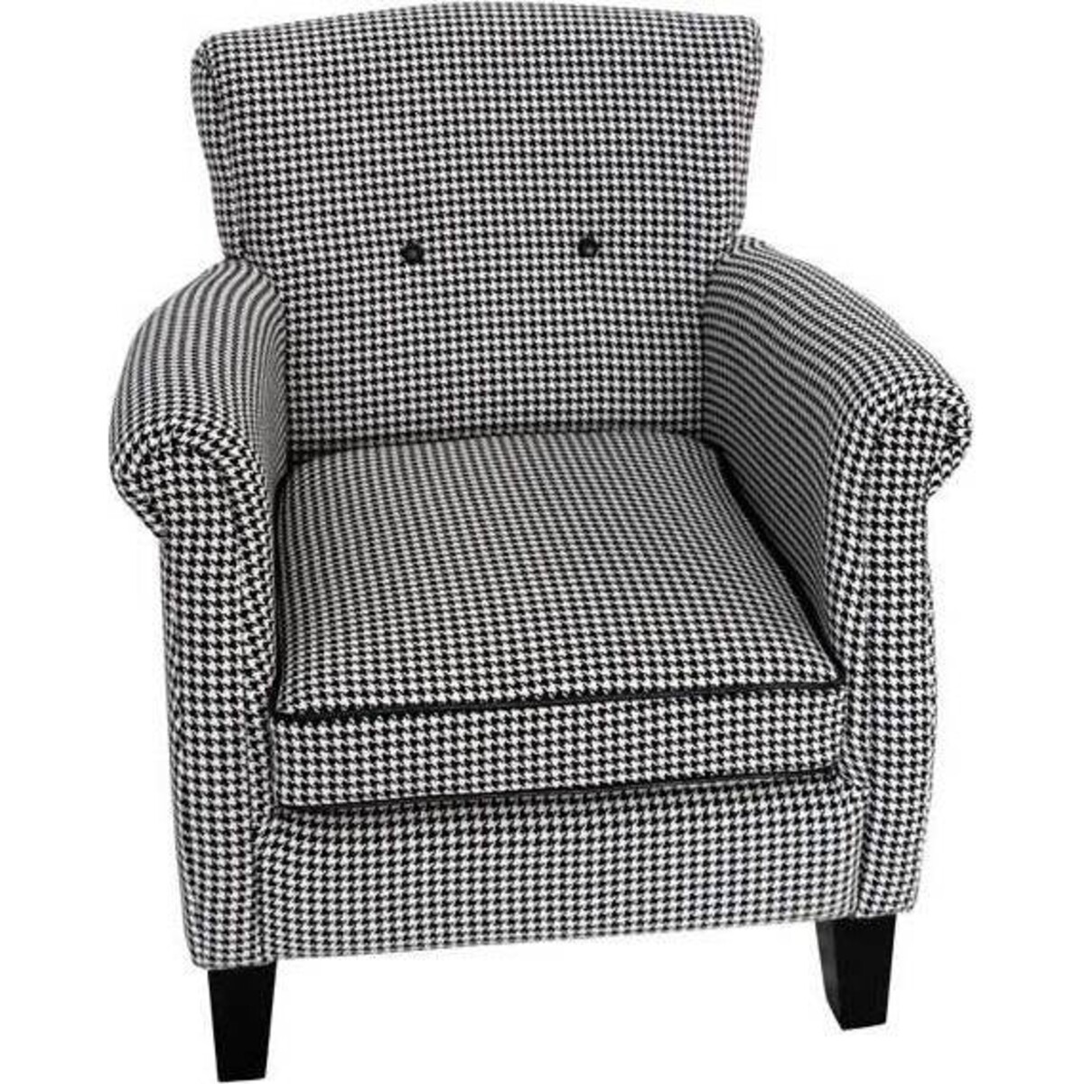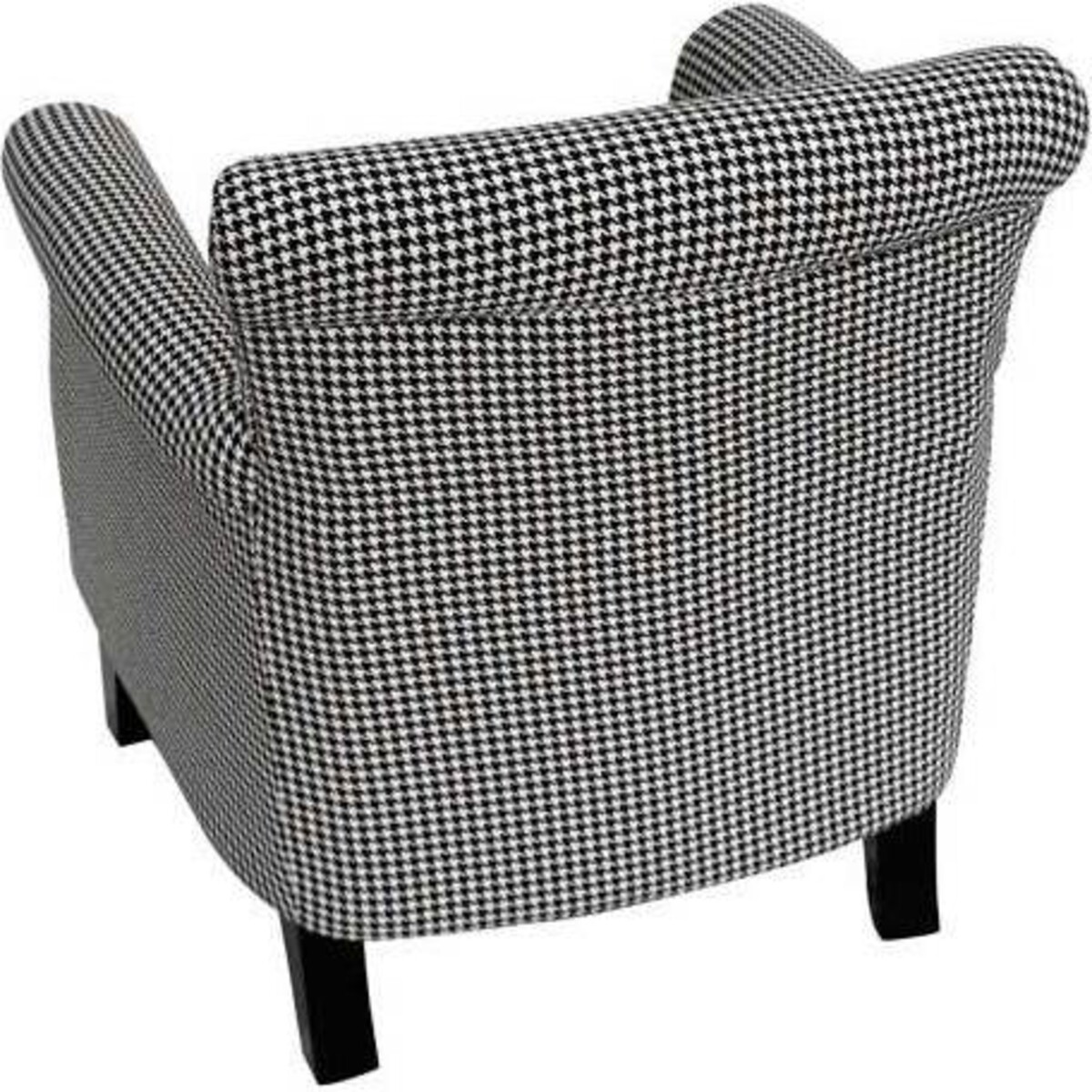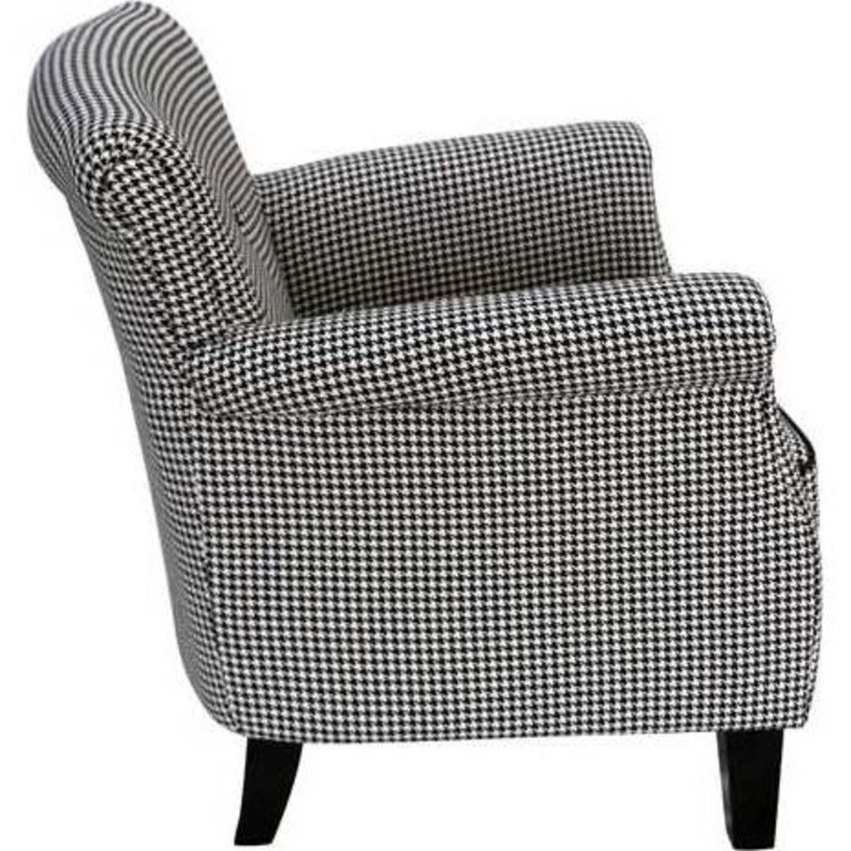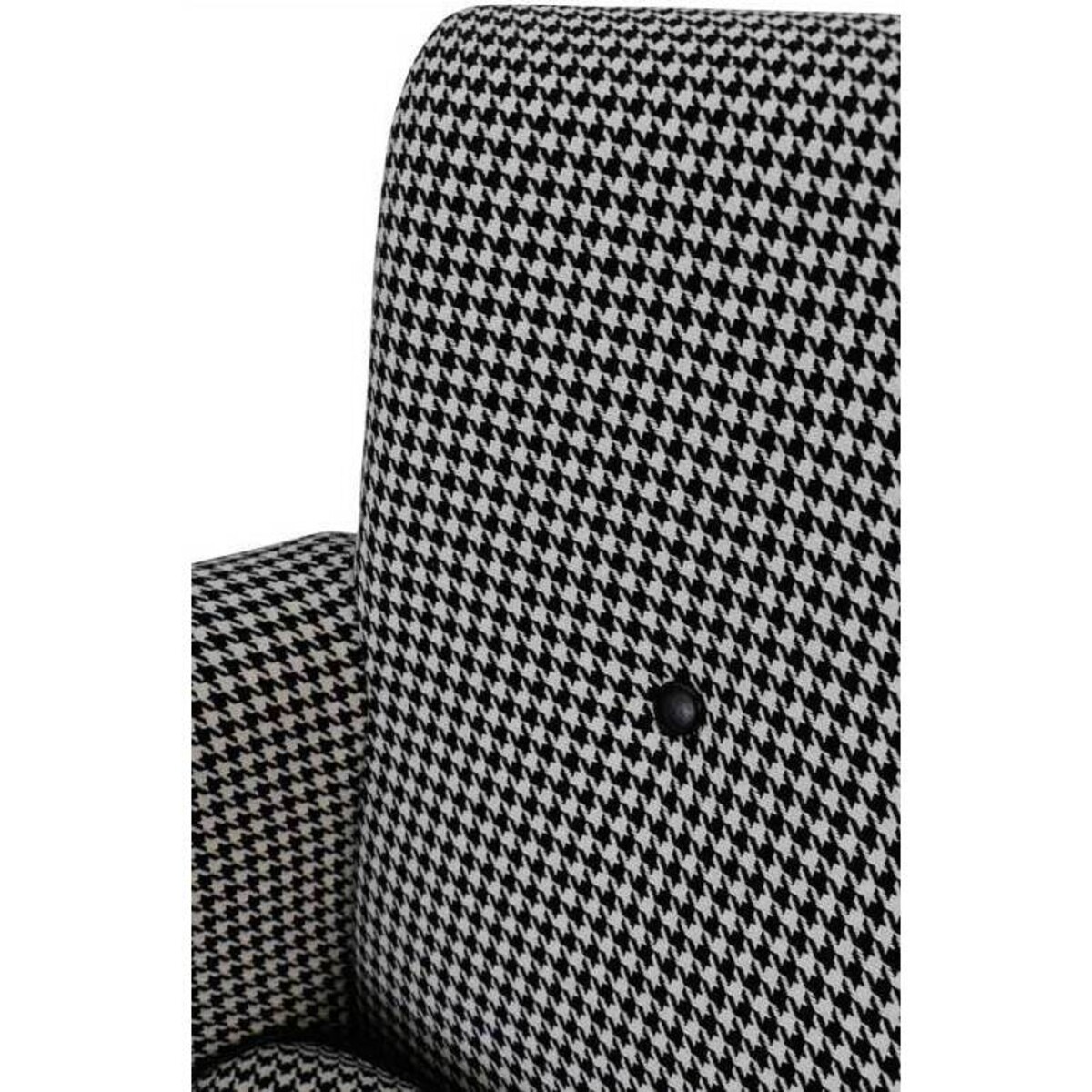 Chair Houndstooth Black measures 74x88x72 cm in terms of Width by Depth by Height. It exhibits a unique blend of Houndstooth black cotton and birch, projecting an amazing look especially suitable for official settings. People who own homes may utilize one or several of these chairs for the living room and other spots such as the balcony area. Two buttons appear distinct on the top part of the seat, which features a traditional - looking design. Chair Houndstooth is a comfortable place to sit when reading a magazine or newspaper due to its long armrests. The checked cotton material used on it is easy on the eyes and matches with numerous settings.