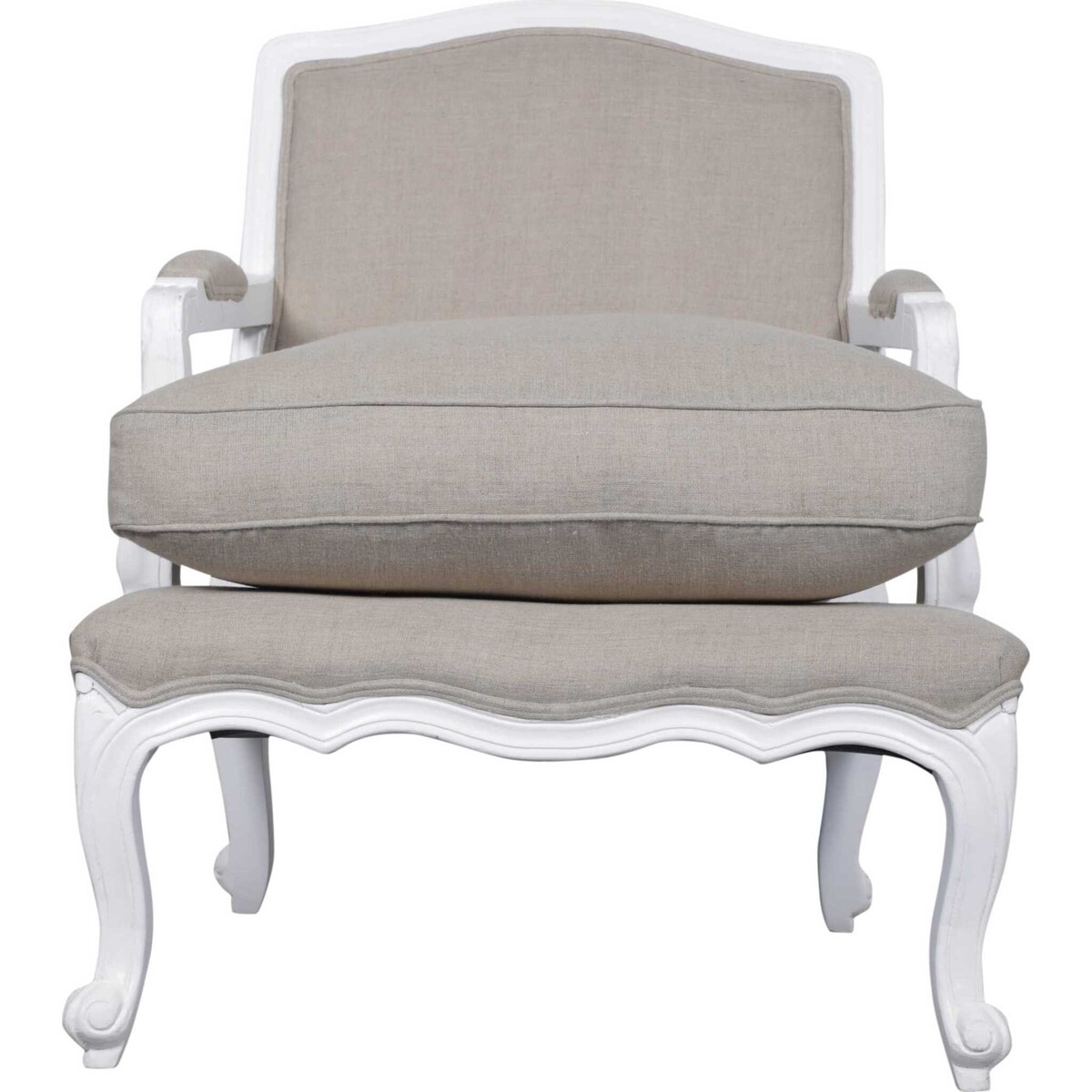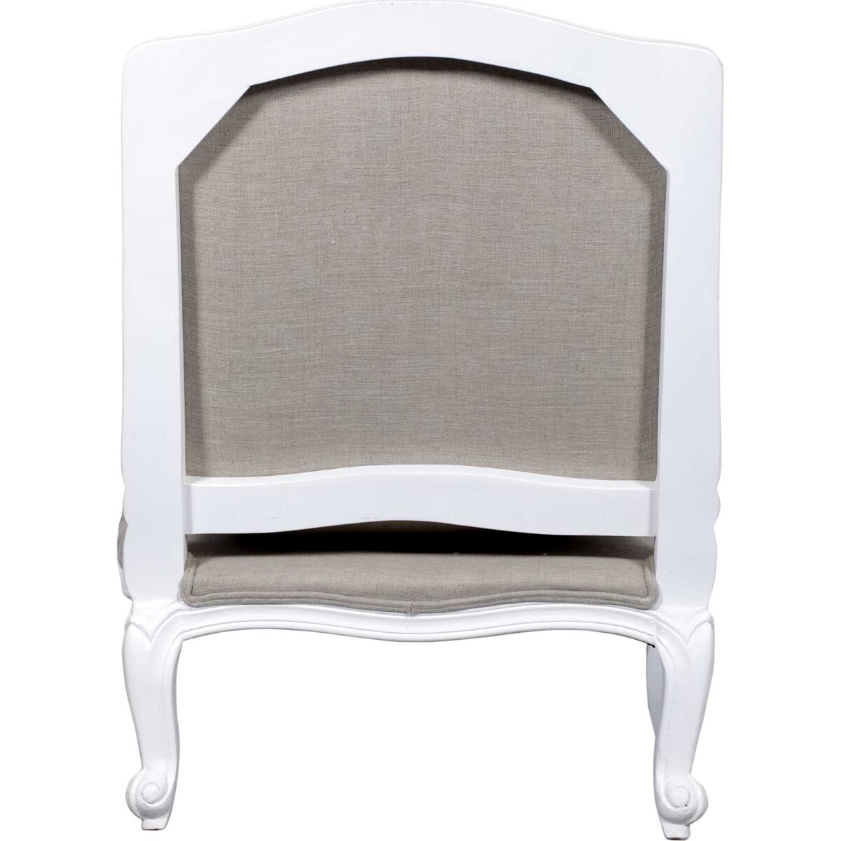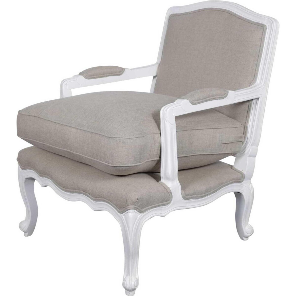 Our vintage French armchair is covered inside with neutral coloured linen and has a tight seat with a firm but soft cushion on top. The outside back part of the chair is covered in linen fabric and the complete upholstery is finished with a flange. It has a beautifully curved back, strong and durable structure with hand - carved solid mango wood exposed frame that is nicely detailed with cabriole legs and is painted in a white paint with a clear waxed patina finish. This piece of furniture includes one chair and one cushion and is 70cm x 72cm x 87cm in dimension.