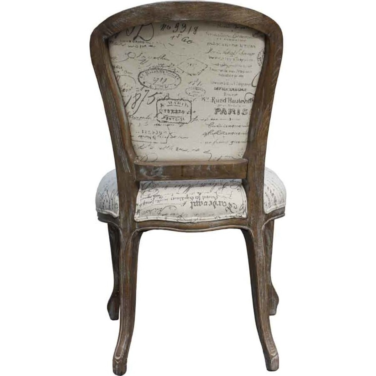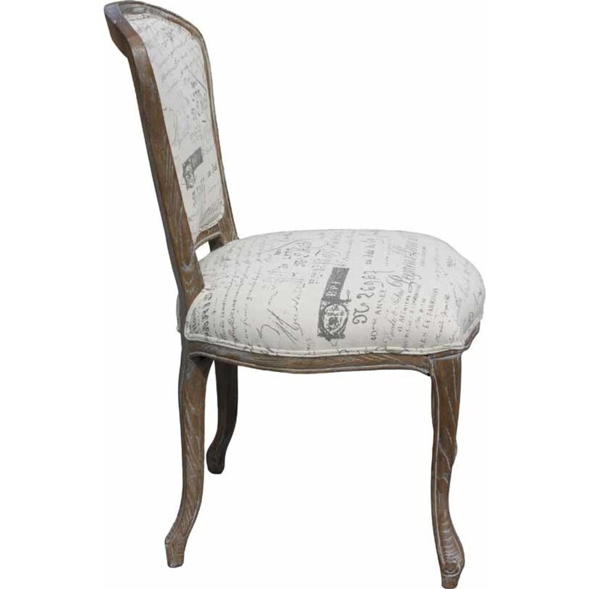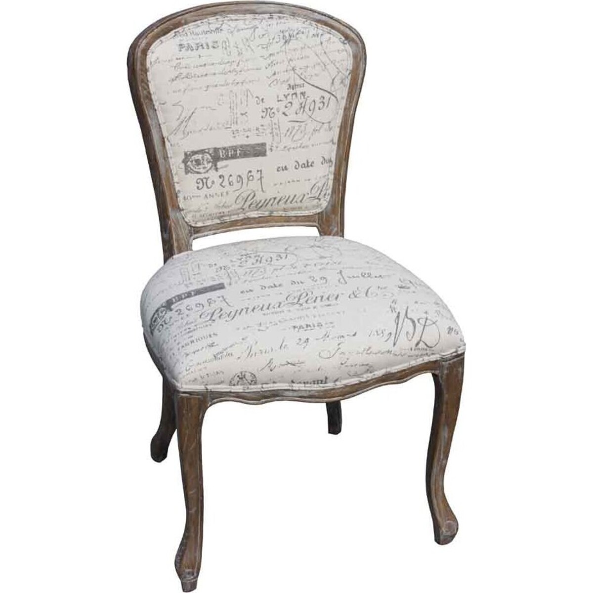 It is very apparent that the chair is not just the usual furniture people use for sitting on. With its amazing design elements, the Chair - Loui Script is a centerpiece in itself. The chair has a dark wooden frame and legs. The back is slanted to the rear for comfort. Its top rail is made very simply - curved in a slight convex, the stiles a bit angled to the back, and a flat shoe. The apron of the chair, under the slip seat, has a classical curvy design. The slanted stiles are directly attached to the legs - as if the whole chair was carved out of a large block of wood. The legs are almost straight, except for the curves at the end. The manufacturers have used very thick upholstery on the seat and the back rest. Its fabric is in a very light grey - almost a dirty white. Finally, it is printed with French words, dates, stamps signatures in beautiful slanted script.
