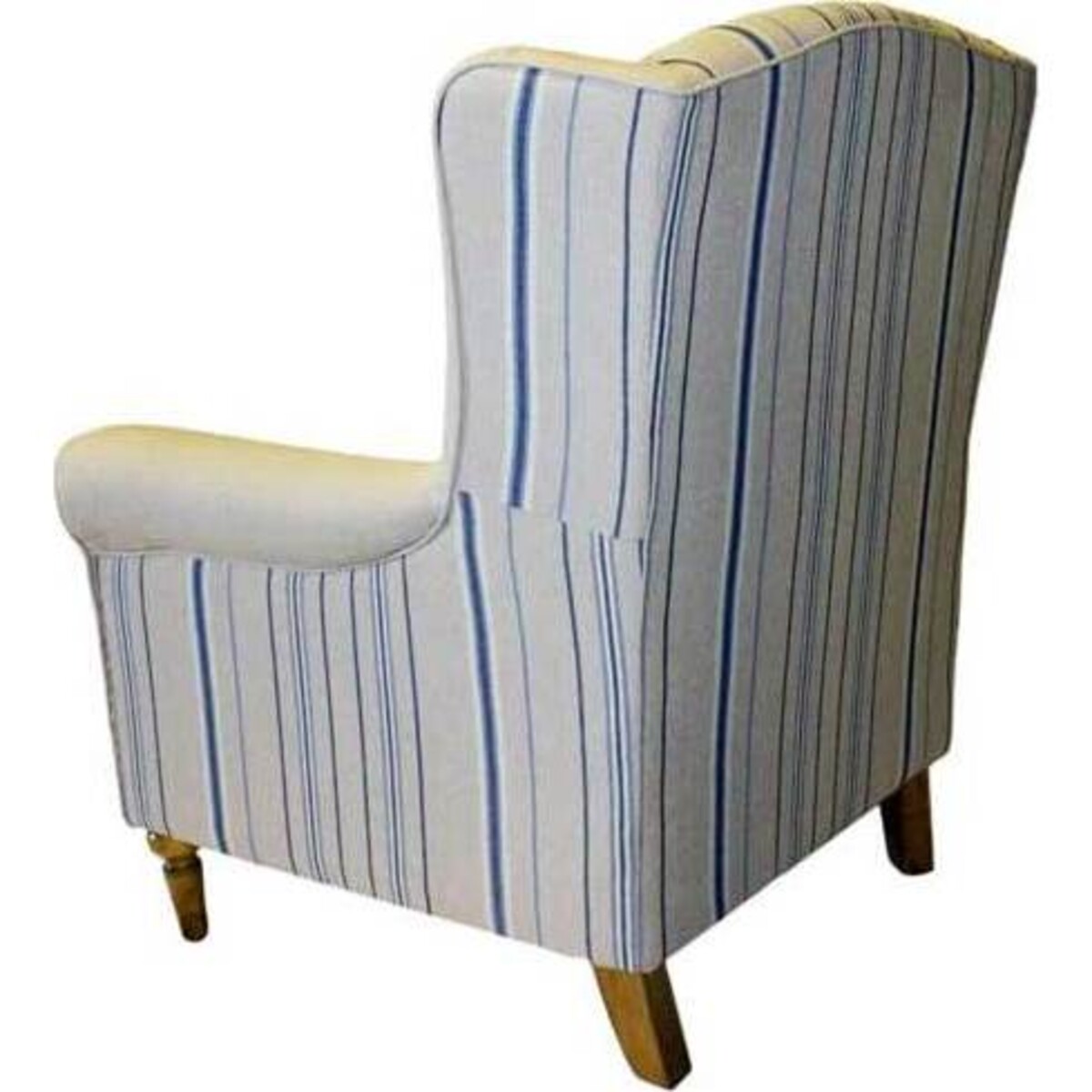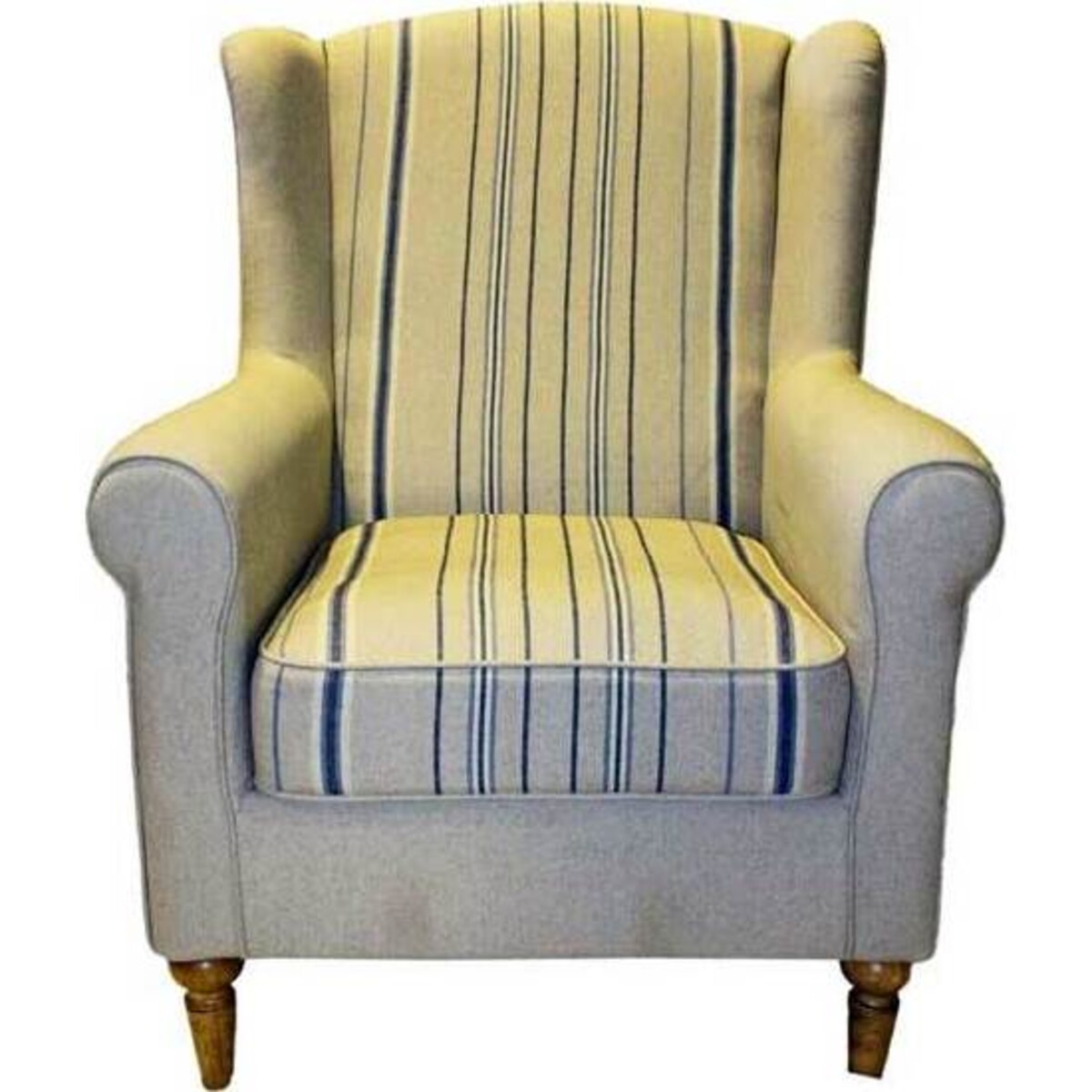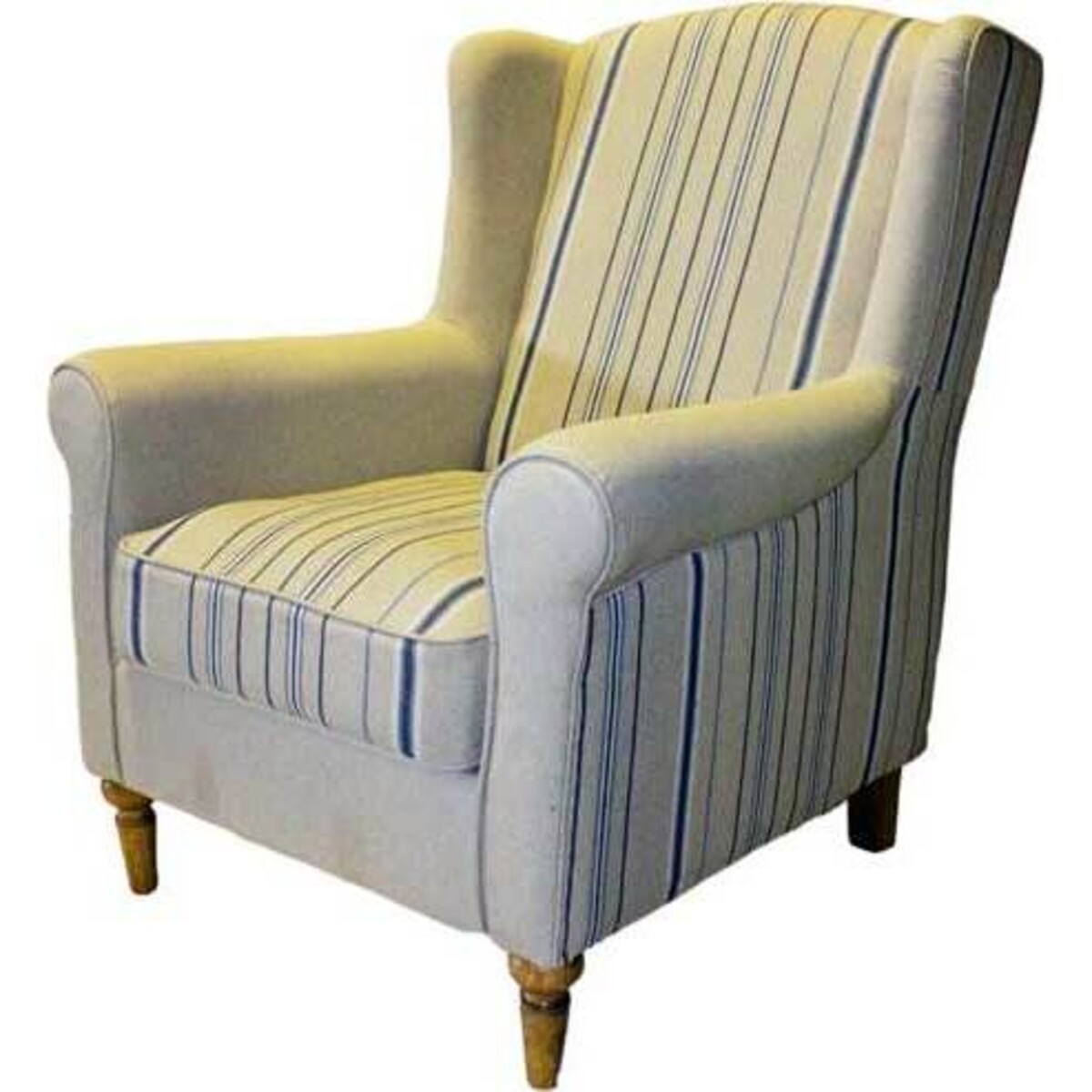 The Sommerset stripe chair is a beautiful and casual piece of furniture that wouldn?t look out of place in any home. It?s the kind of piece that says ?sit on me and be comfortable?. The main fabric is an off white or cream colour, and running throughout the seat, the back and the sides of the chair are these wonderful 9and elegantly simple) stripes of blue and white. Other pieces of the fabric, such as at the bottom of the chair and on the arm rests are non-striped pieces of the cream fabric. This mix of plain and striped fabric helps to accentuate the design of the chair itself while helping to amplify the simple and elegant beauty of the designed fabric. The chair itself sits in four sturdy legs made from a light wood. The two front legs are rounded, white the two back legs are more rectangular in design.