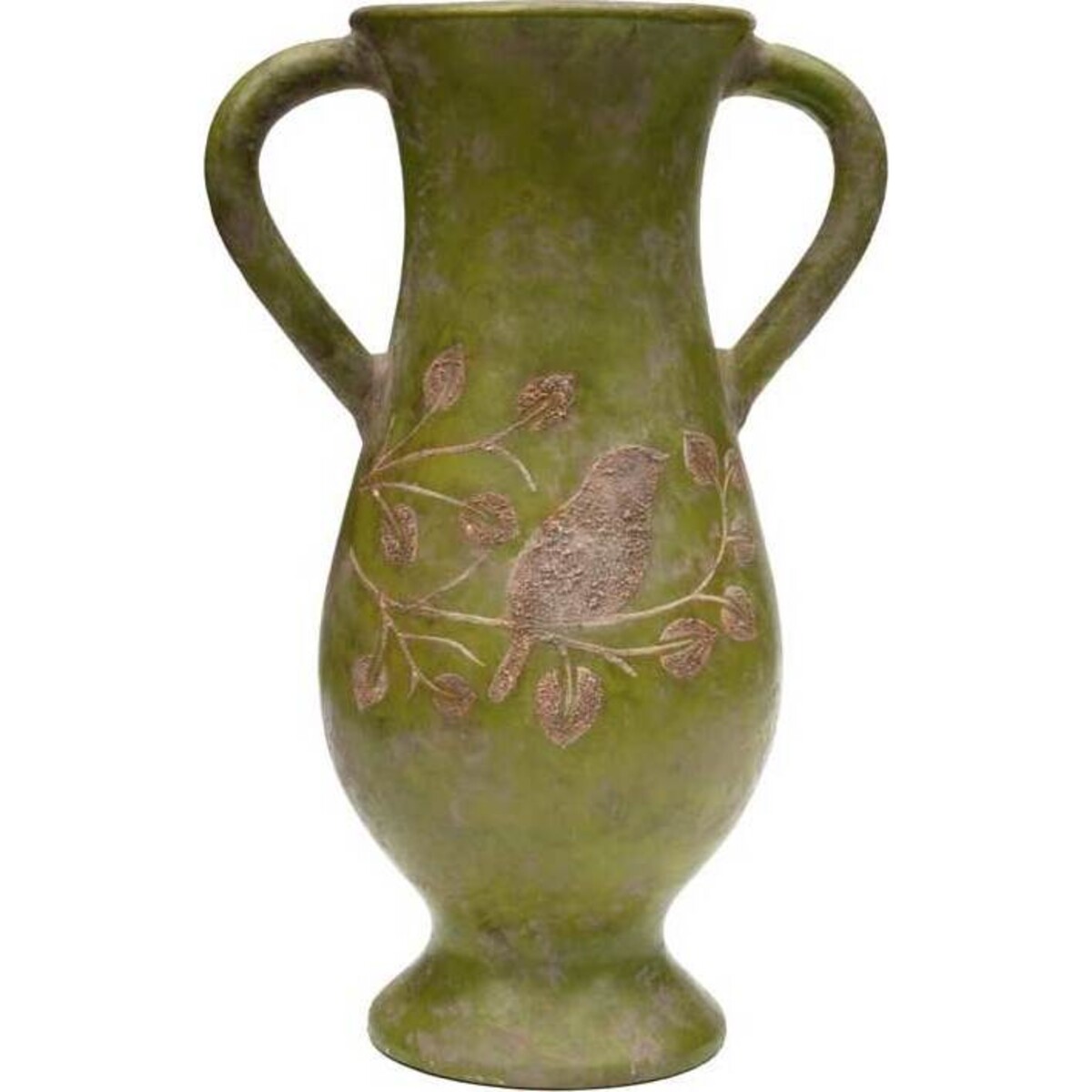 Introducing the Grasse Chateau Vase from Lavida. It has a fabulous unique shape with handles on either side so you can easily carry and manage it when necessary. The green colour with tan textured bird and leaf design make this a truly special piece you'll adore having in your home. Thanks to its lovely colouring, you'll have no problem with matching it up with any room in your home where it will surely add a nice burst of colour.