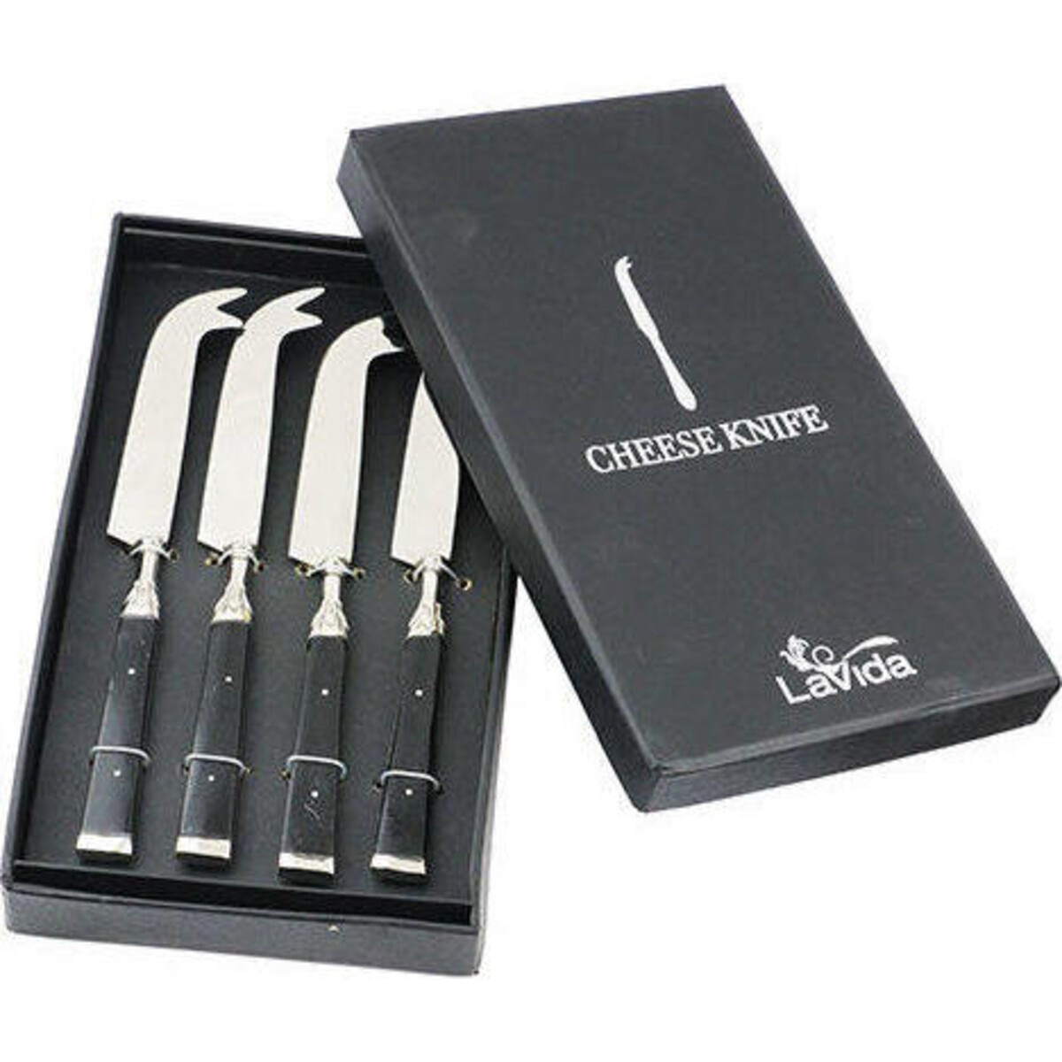 Lavida serves to all kinds of needs especially when you are discrete in your choice of accessories for the dinner table and are looking for specialist knives that are meant for slicing cheeses. Here is a set of four that are especially designed to cut into semi hard cheese with ease and makes for alovely display on the table. A neat well crafted riveted handle with a fairly broad palette knife and atip that is forked makes it the best choice for slicing semi hard cheese. The set of four knives will make your table setting look all the more elegant and its storage will be easy in its designated box in which it comes to your from Lavida. Great on materials quality as well as design. These knives are fabricated from high quality stainless steel and resin given a tiny little design detail.
