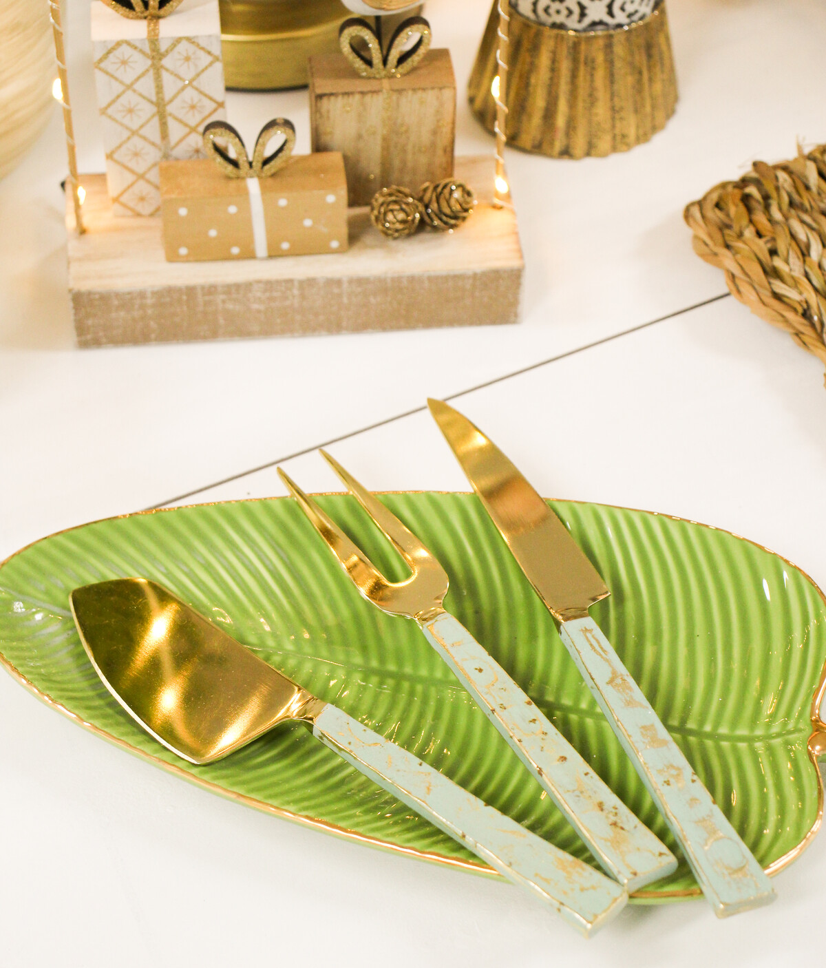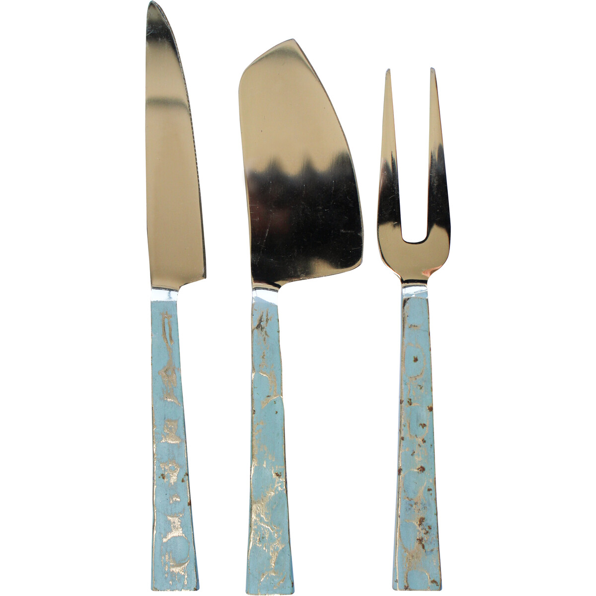 Using only the best stainless steel material available, each knife contained in this Cheese Knife Mix Beverly Hills S/3 has an ergonomic handle which offer customers a convenient but firm grip during use. The handles are hued in a soft shade of blue before being ornamented using a touch of silver or gold depending on the colour of the end of the knife. This presupposes that the knives are lacquered in either gold or silver and are perfectly food safe. There is a large, medium and small size.