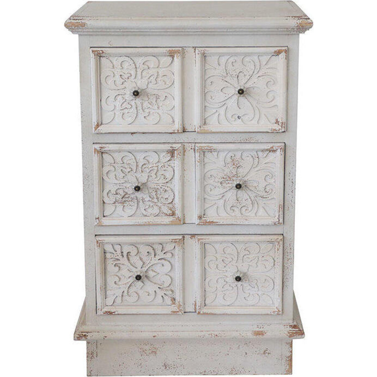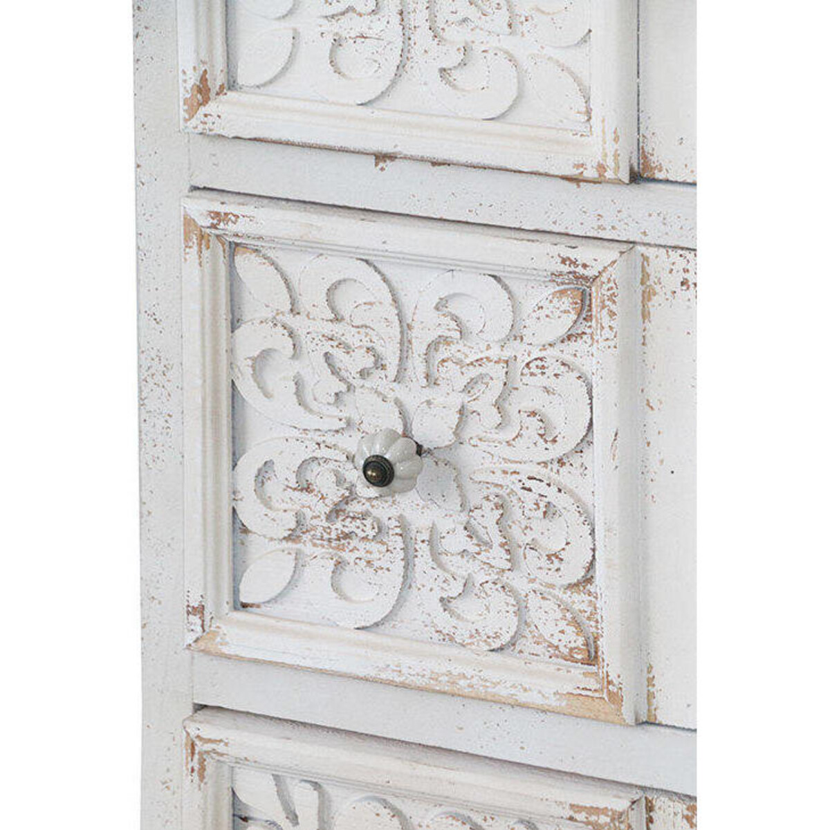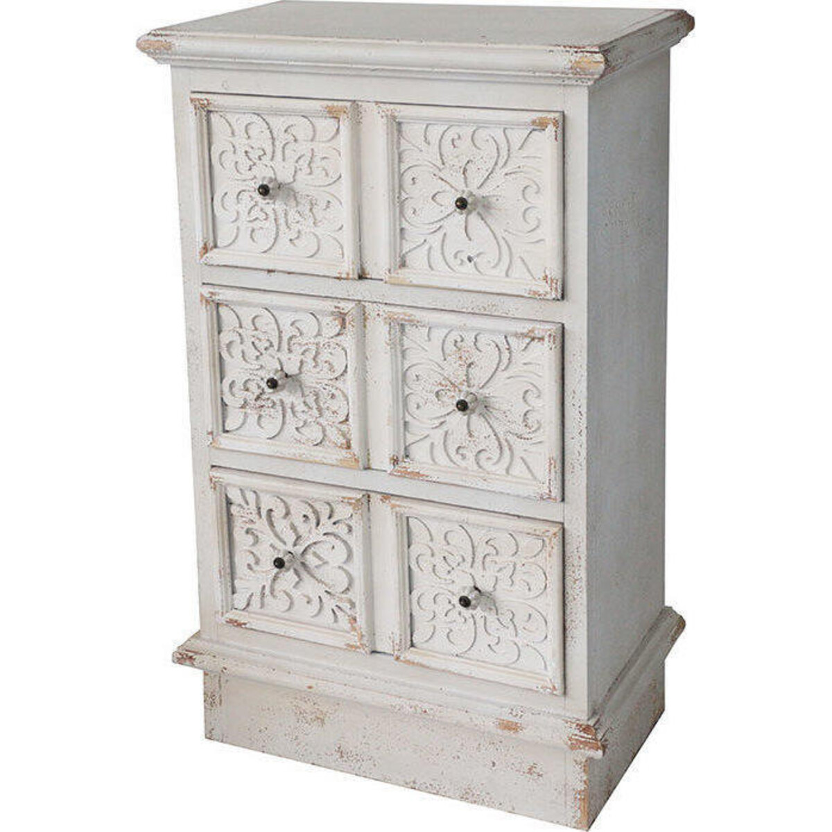 Make an impression with the most stylish set of furniture on offer from Lavida who know that a simple inclusion of chest of drawers such as this in itself could be a statement piece. Made of wood with a pattern on the frontage created with MDF, the base has shabby chic accents while the front of the easy to pull drawer have a lovely pattern all in white. The space in each drawer is adequately large to store all kinds of things that one could or would want to access in that space - could be crockery and cutlery or sparer napkins and serving bowls - there could be so many ways that this organizational space could come to use. Th height of the chest of drawers is 105 cm while its width is 63 cm and so is its depth. Which makes the size of its six drawers quite deep and spacious. The white paint which is rubbed off in places along with the clear signs of ageing makes the look all the more charming and modern despite all of its antiquity. Homes that have a modern setting heavily in favour of a period look or shabby chic would love to host such furniture piece son offer from Lavida.