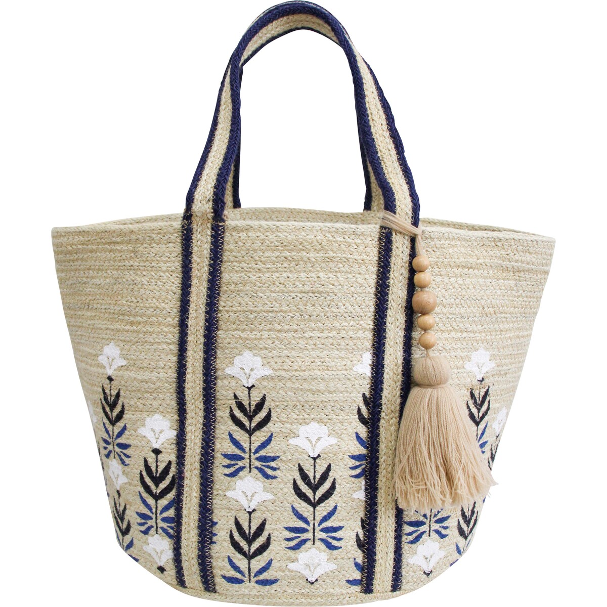 Introducing the Chica Jute Bag, an exquisite addition to any homewares and giftware collection that exudes natural elegance and functionality. Handcrafted with the finest jute, this alluring tote bag boasts dimensions of 50x30x30cm, plus a handle that ensures comfortable carrying. The beige colour palette is accentuated by striking navy blue stripes and intricate white floral motifs, lending it a timeless aesthetic charm that seamlessly blends with a variety of home or office décor styles.