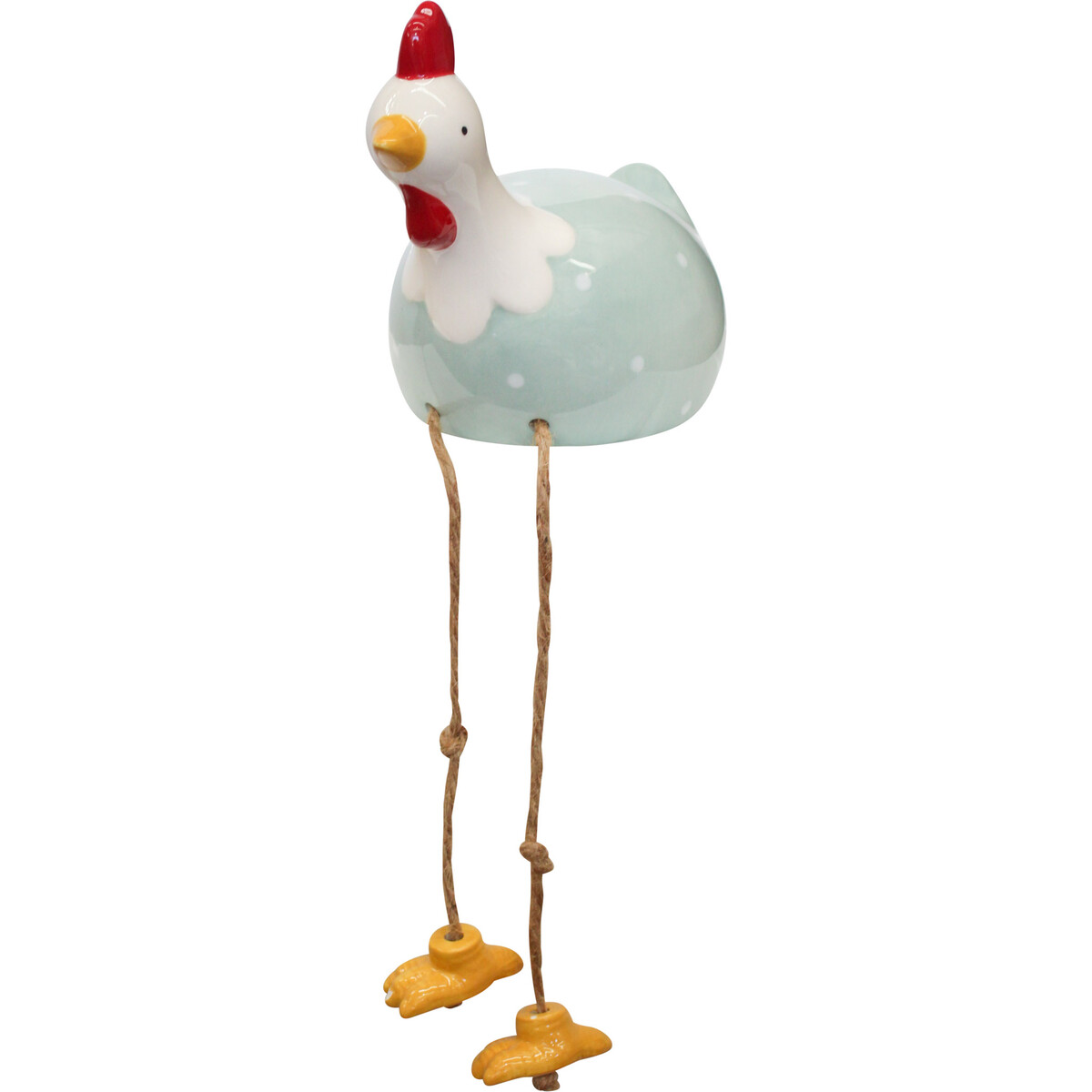 Did you know that chickens can run as fast as nine miles per hour? Incredible right? In essence, they can run a mile in exactly six minutes, forty seconds on those thin, wobbly looking legs which are represented creatively through the use of jute rope in the design of this Chooken Resting Teal! Inspired by these cuckooing birds, this chicken themed ornament is crafted through the moulding of top quality ceramic material. Its body is predominantly lacquered in soft shade of teal green while being dotted in round whites. The neck feathers are white, the beak and feet are yellow while the comb is red.