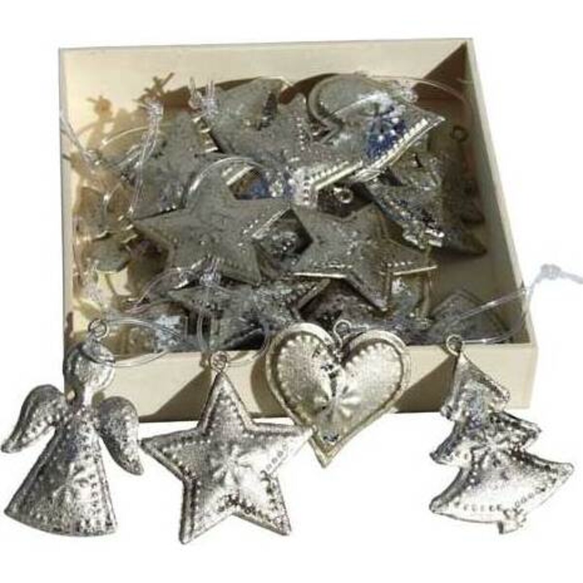 The look of hand-punched tin is brought back this Christmas season in this set of 24 Christmas Hangers from LaVida. Three-dimensional Christmas shapes, including an angel, star, heart and Christmas tree are crafted from gold- and silver-finished metal and hung with a clear, plastic hanger. Add these hangers to a Christmas tree to bring back the memories of Christmas gone by. Added to a string or garland, these hangers would make a festive swag on a mantle or railing. Or, use a hanger to adorn a Christmas gift or even at each place setting of your holiday table for a special, added touch of Christmas cheer.