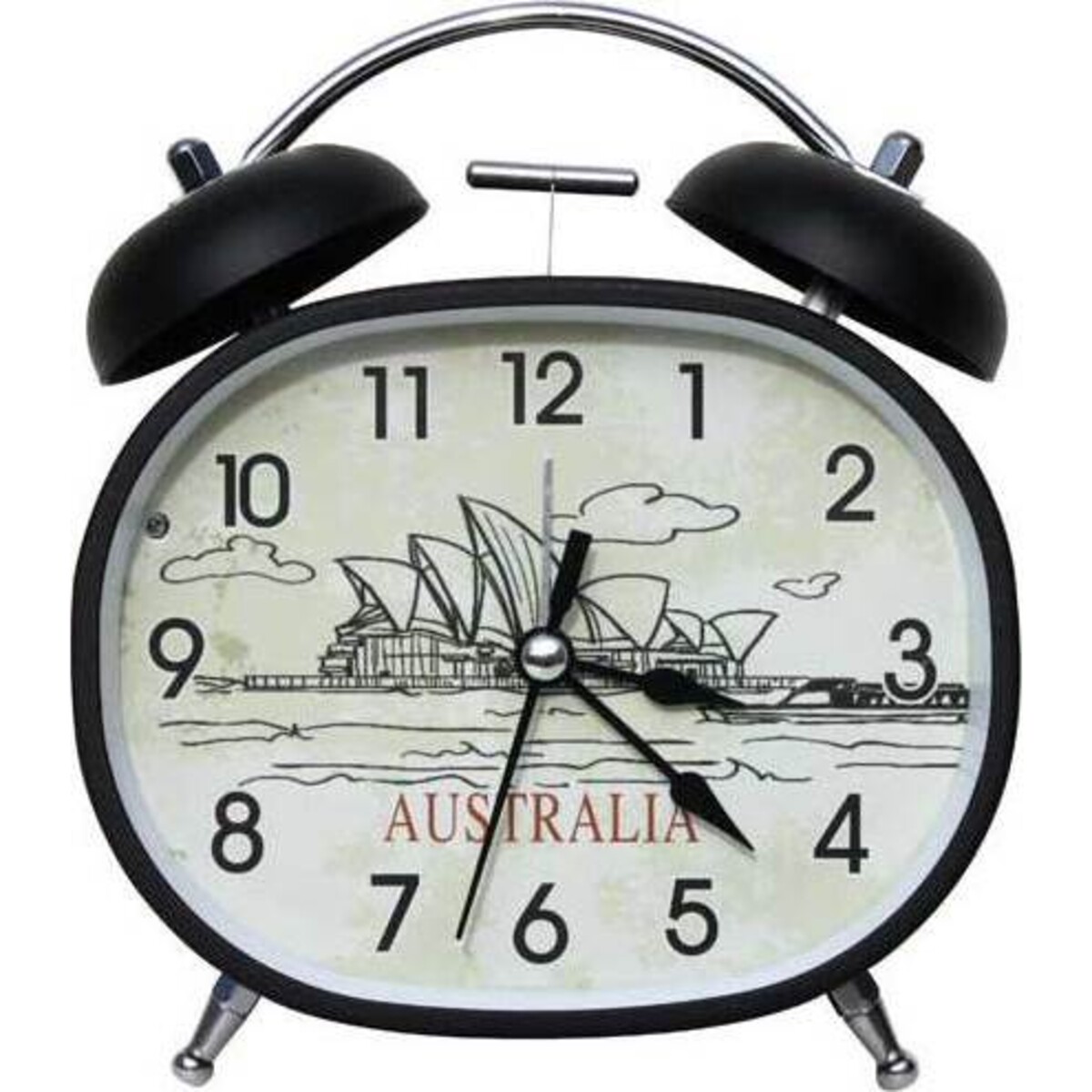 With its simplistic beauty, it's sure to be a great addition to your home. The clock consists of a black body, black bells, silver legs, and silver accents at the top. The face of the clock is white, features an image of the Sydney Opera House, and proudly boasts "Australia" underneath in red lettering. The numbers and hands are black, so you'll be able to see the time from a distance. It's certainly a piece you'll want to wake up to every morning.