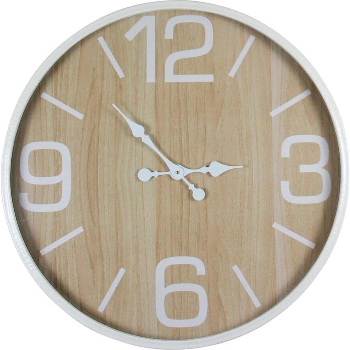 Functionally accurate in its time keeping and sizes in a way that will make it as great for a large room as it would in a corner of a smaller room-Afterall, with a face as large as 80 cm , you would surely make quite an impact, and this is where its very soft colour and simple design plays out its part. The delightful modern design allows it to be used in any part of the home with as much style and impact. Will look great in the long corridor or above the fireplace. You could have it dominate a large wall where you may simply add a book shelf and few Knick knack to complete the solid contemporary look. The face of the clock imitates the woody grain work of real natural shade wood and thus adds to the rustic charm of its look. The clock captures in essence the very feel of the modern style living with its simplicity and clean fresh looks. The round face is enclosed in a white frame enhancing its colour concept.