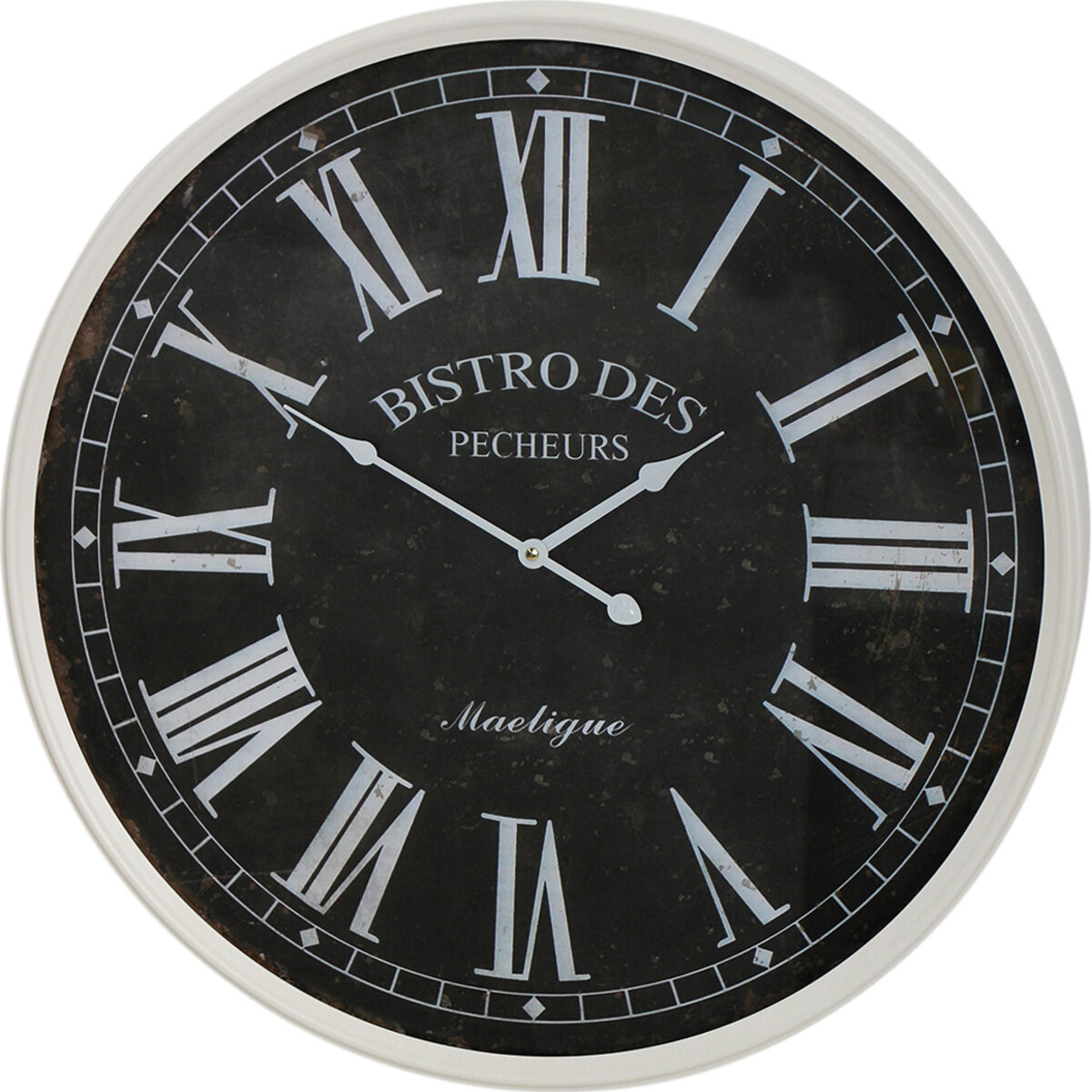 The Clock Bistro Framed White employs the Roman Numerals in its time counting. It is made in a large 60 centimetres wide dimension using specially engineered Medium Density Fibreboard material which is lacquered luxuriously in white paint. The clock hands are also a metallic black while it is encased by a crystal clear, highly translucent premium quality glass. Written on the wall clock are the words "BISTRO DES PECHEUR Maeligue". There is two of this clock in every carton that you order today.
