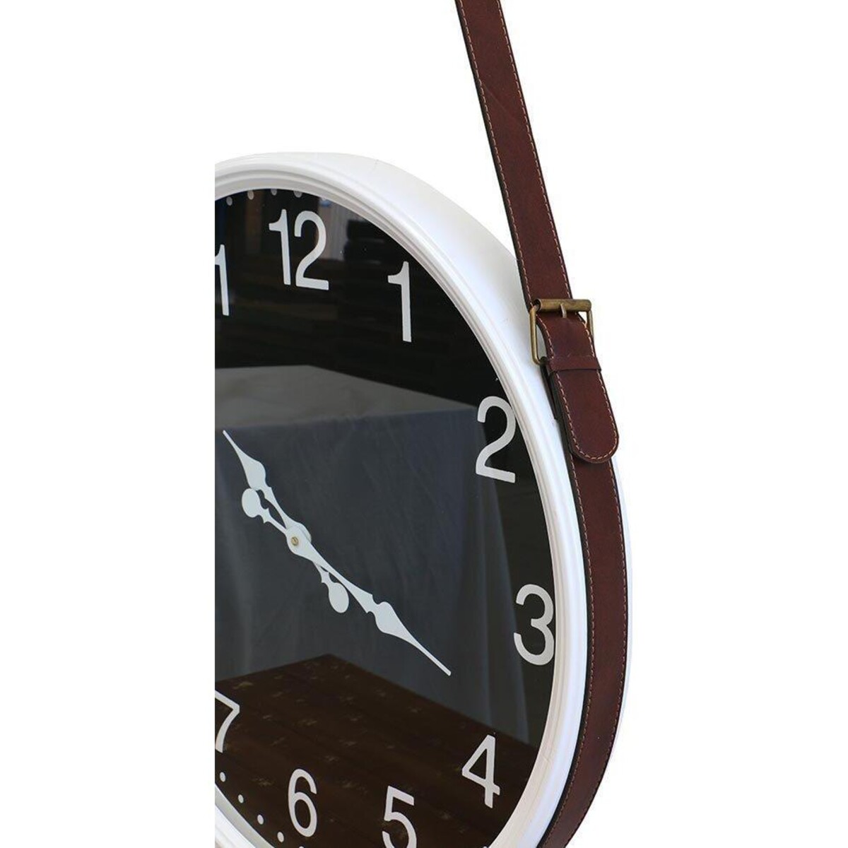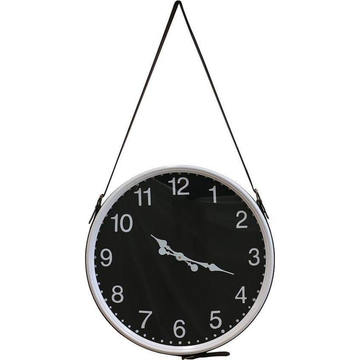 It's all black with a mock-leather strap that allows it to be placed on the wall effortlessly. This 60-cm diameter clock will make such an impressive splash of style with its dark and handsome good looks on the wall while all the while keeping perfect time. You will find that this style and design syncs wonderfully with all kinds of design, be it antique, classic, modern or retro modern. Place this on a large sized space as its size would be commensurate with that. The lovely feel of the dark colour contrasting with the leather hanging provision makes it very country and rugged in appeal as well. The clock has white edging and hands as well as digits in white making the visibility of time all the easier. The stark contrast of black with white too makes it a true retro charmer. The great quality body is fabricated from metal while its face is covered with distortion free high-quality glass. The hanging strap is made of faux leather which will be more than sturdy to take the weight of the clock.