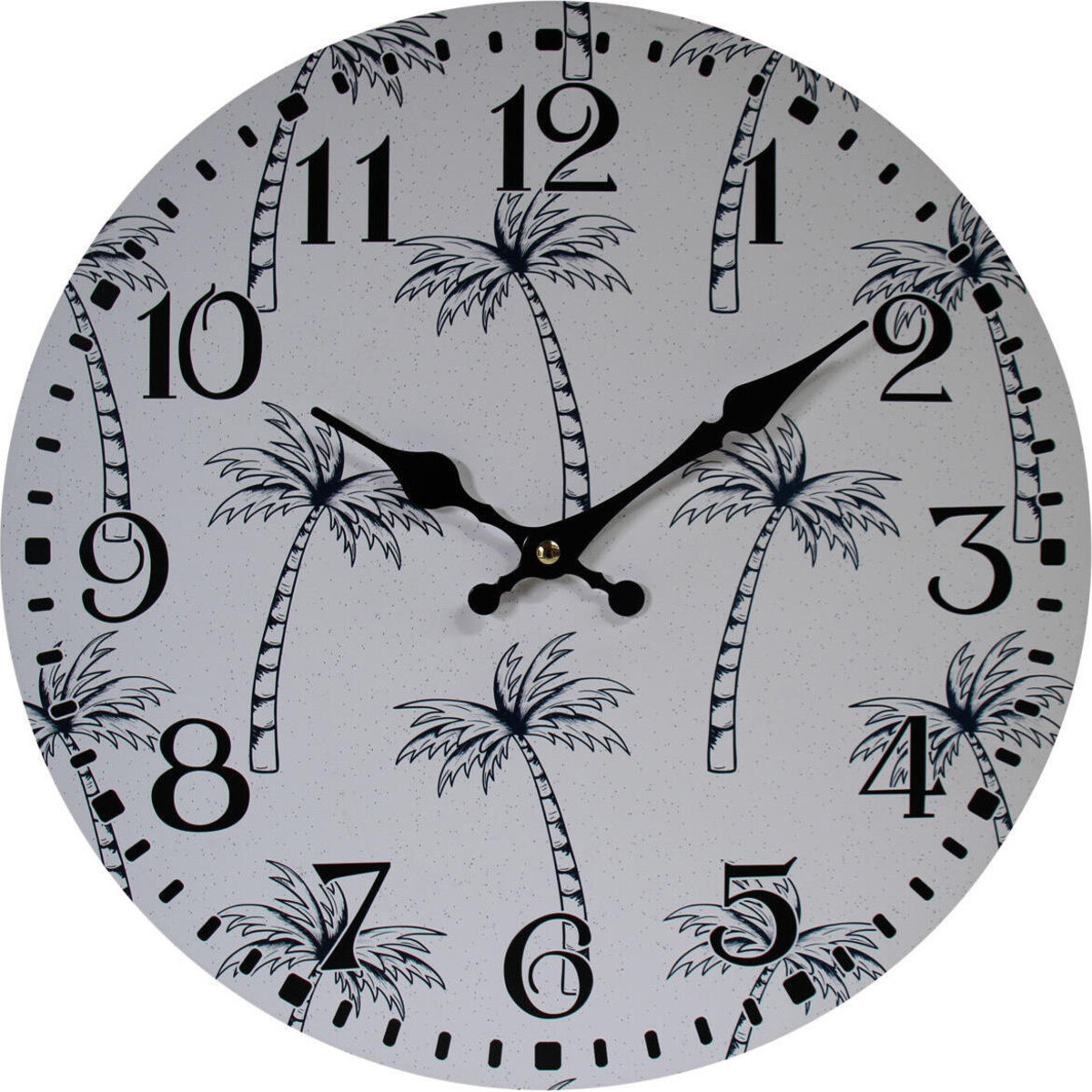 With this sleek and sophisticated clock, you can easily add a tropical touch to any bare wall or room display as its black and white colour will match any existing colour scheme. Featuring a round, smooth design having a lightly dotted white background with palm tree motifs, this 34cm clock makes a perfect pick for any eclectic aesthetic or as a charming statement piece in any space.
