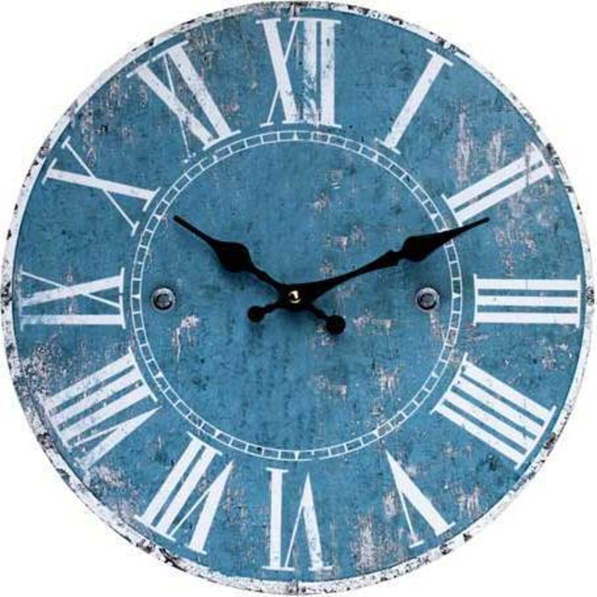 Featuring a vibrant blue background, this round clock looks like it comes straight out of your grandmother's attic. It's slightly weathered and worn to give it an extra dose of charm. The Roman numerals are large and white, and black hands point the way as to the time. Guests may think you spent a fortune for this piece at an antique shop, but you know how little it really cost you. Don't worry, we'll keep your secret.