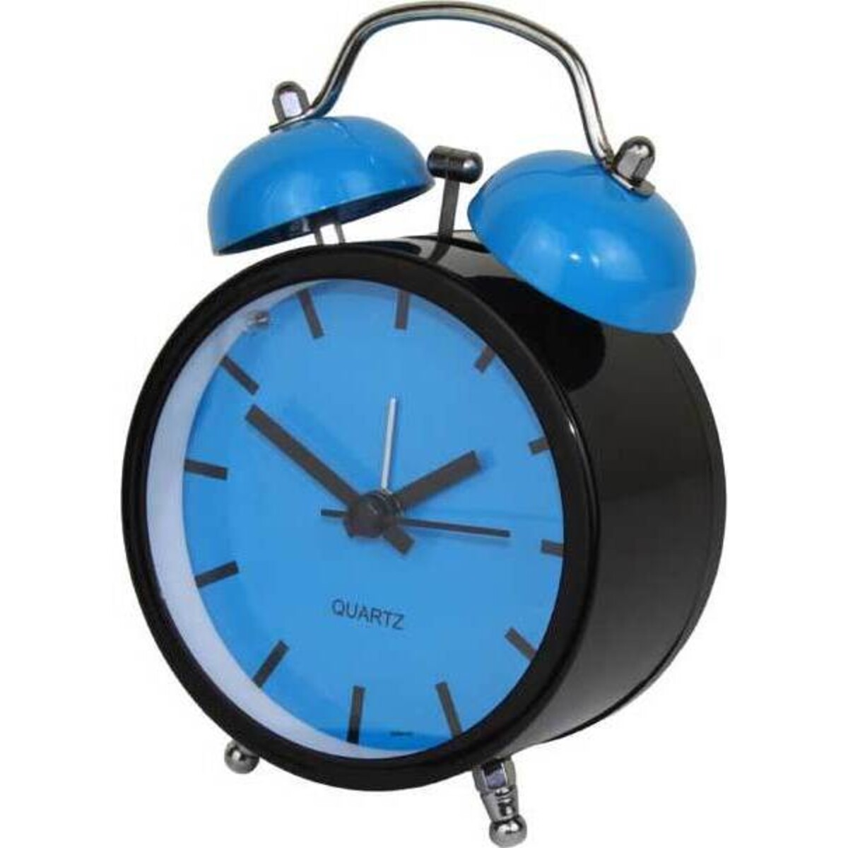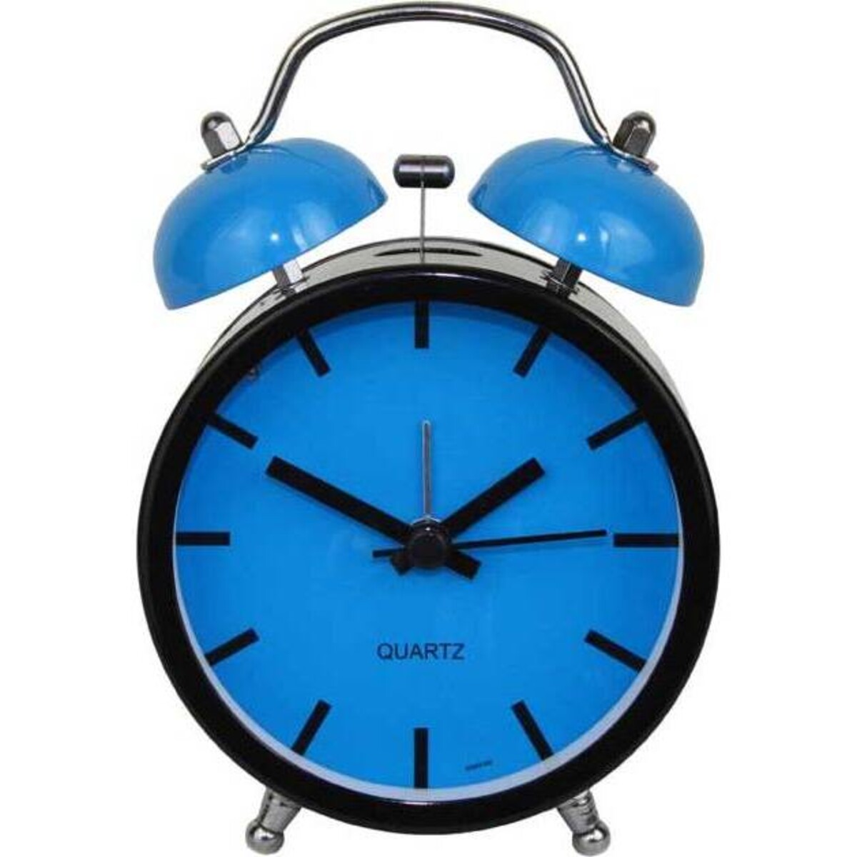 Clock Bold Blue Small is a metallic clock with a glass front for visibility. It has measurements of 8x13x5 cm and has two blue bells at the top, joined together by a metallic loop. An adjusting knob is in open sight in - between these two bells. The colour blue is applied with discretion as well for the interior face of the clock and the word éQuartzé can be seen in - between the centre and bottom sections of the interior region. This product also has two support - legs at the bottom and adds greater appeal to the ambience of any home, no matter where it is placed.