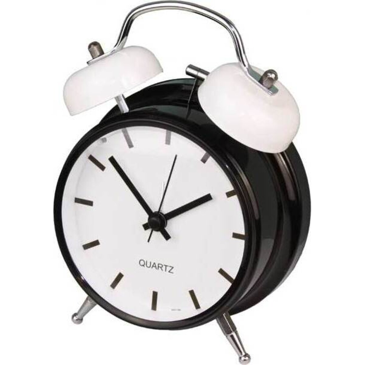 Clock Bold White Large is voluminous, having dimensions of 12X16X5 cm and its central body portrays a black tone, whereas two bells present at its top are white and conjoined by a metallic loop. An adjusting knob is in clear view in - between the bells. The external framework is done using metal, with the clock sitting on two shiny - metallic legs. White is employed for the face of Clock Bold White Large and the ticking - hands along with hour - marks are in black. This all offers a good contrast, with ‘Quartz’ being inscribed prominently at the bottom mid - region of this clock.