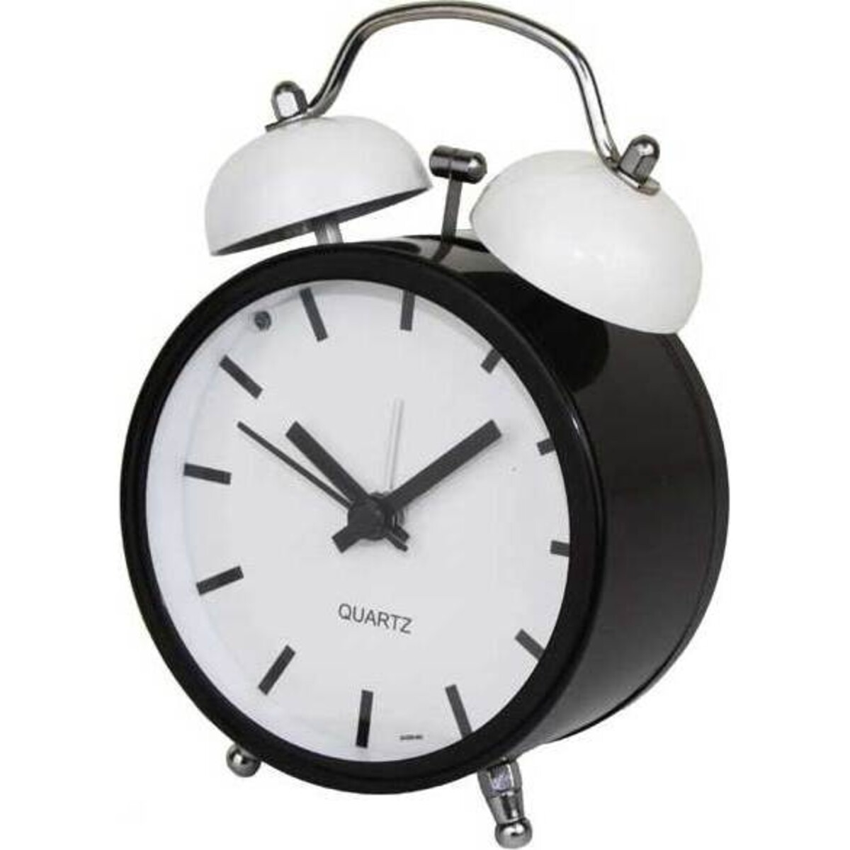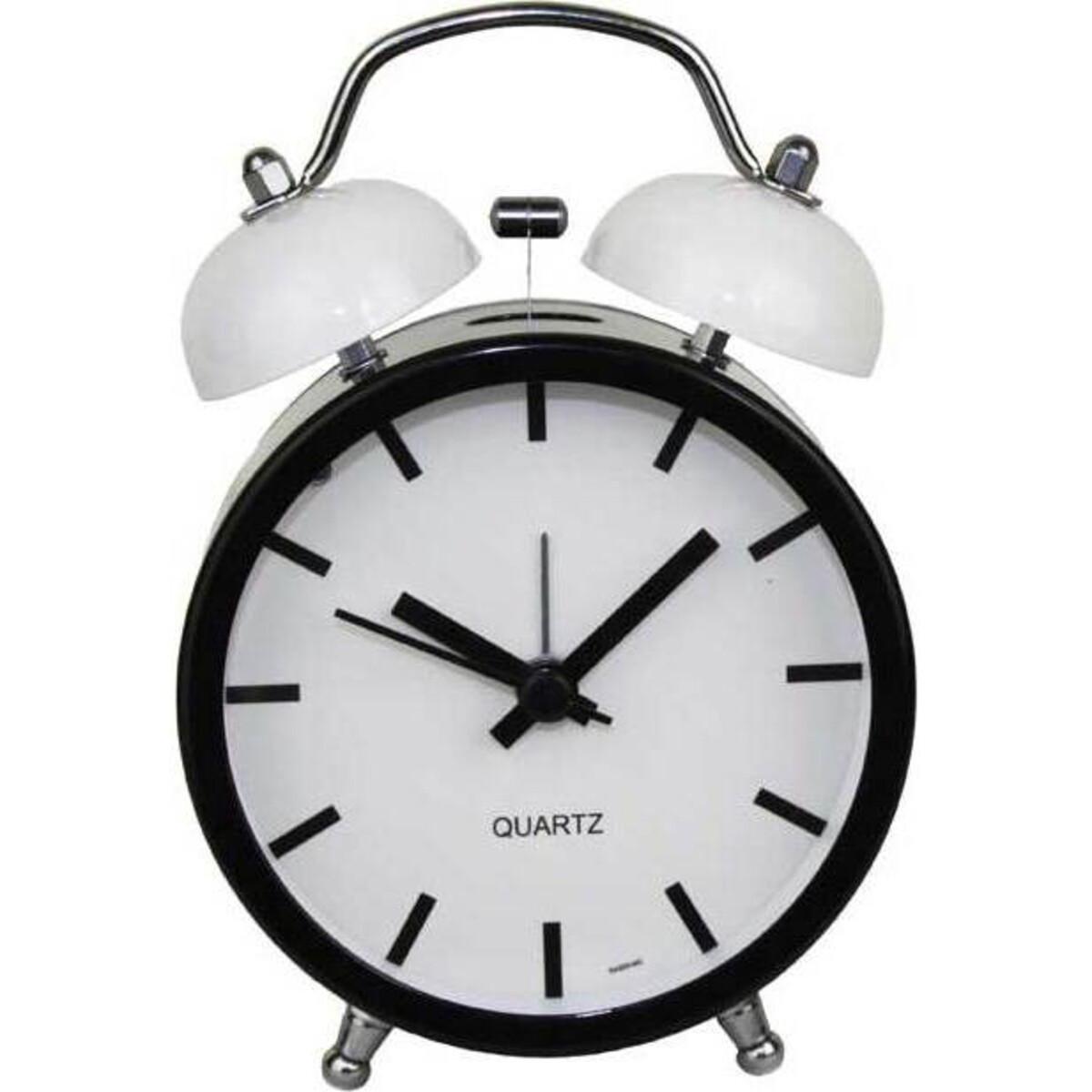 The product Clock Bold White Small measures 8x13x5 cm and exhibits metallic construction for the outer shell and glass for its face. The central body is black in colour, with bells being white, hooked together by a shiny metallic loop, an adjusting knob visible in - between the bells. Clock Bold White Small also features white interiors, with the hour - marks and ticking - hands bearing a distinctive black. It sits on two metallic legs and the word ‘Quartz’ can be seen inscribed with style at the bottom mid - section of this clock. One may place this watch atop a drawer, beside the bed or position it on a shelf within the living room for instance.