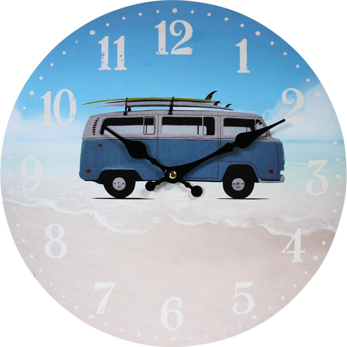 Featuring a tranquil beach scene, its high-quality print shows a camper van parked near the shore carrying three surfboards on its roof and will add a little joy anywhere you place it. This wall clock is also ideal for the children's room or nursery and it looks like you will be soon walking out to the sandy beach and sea. It comes ready to hang in the living room, hallway, den, guestroom, bathroom or kitchen and only the battery may need to be installed to get it ticking.