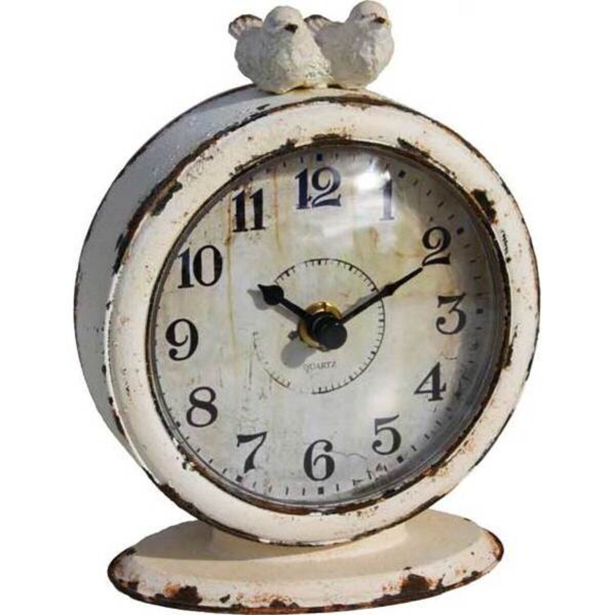 The Double Birds Clock consists of a round off-white facade with an oval base and two small birds seated on top. The white face and black numbers and hands offer a wonderful juxtaposition as does the weathered appearance along the edges as well as on the face itself which give it an aged feel. This clock would be suited best for a home decorated in a country style or one featuring a coastal design, but wherever you put it, it's going to make a great addition to your home.